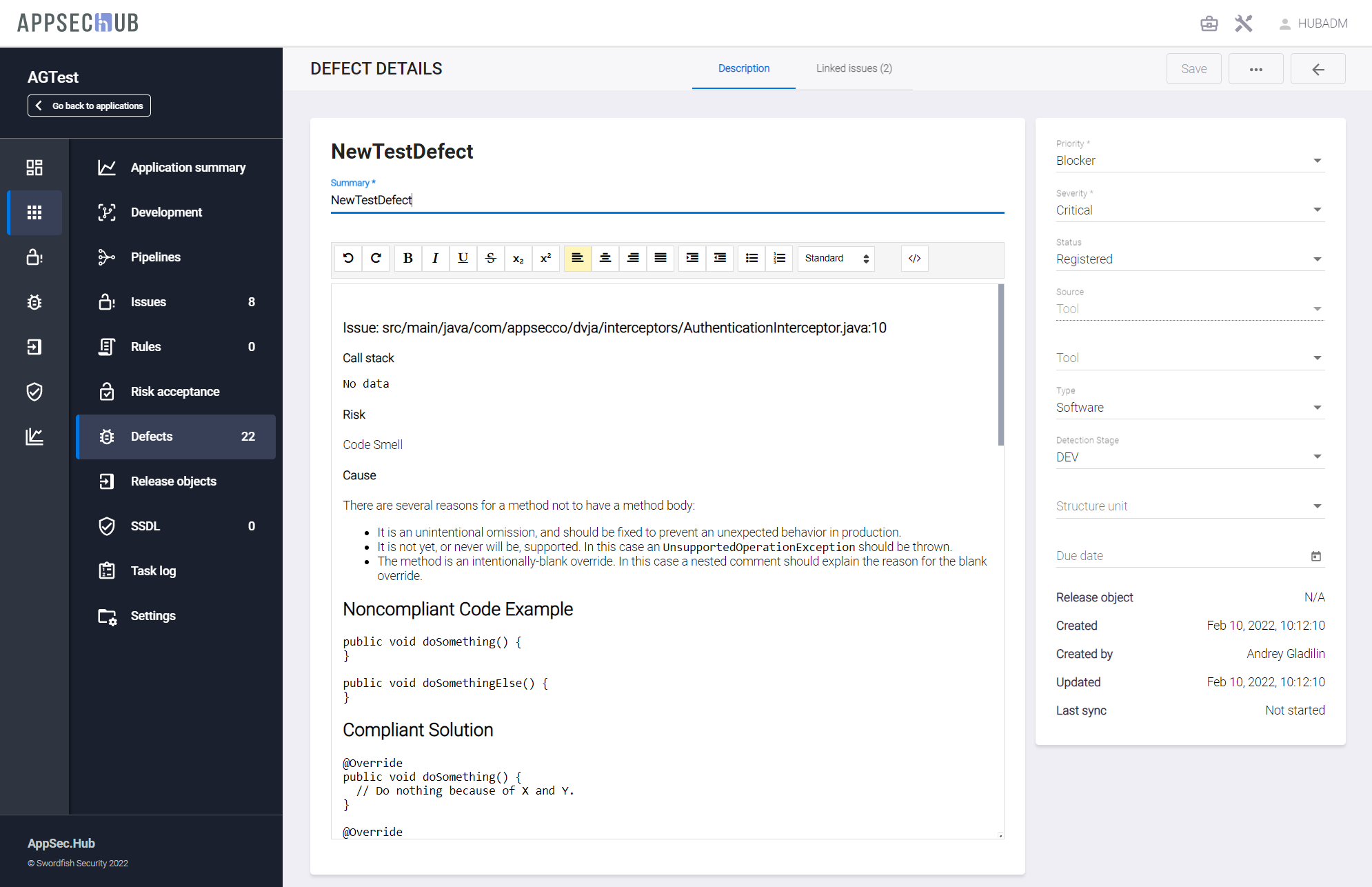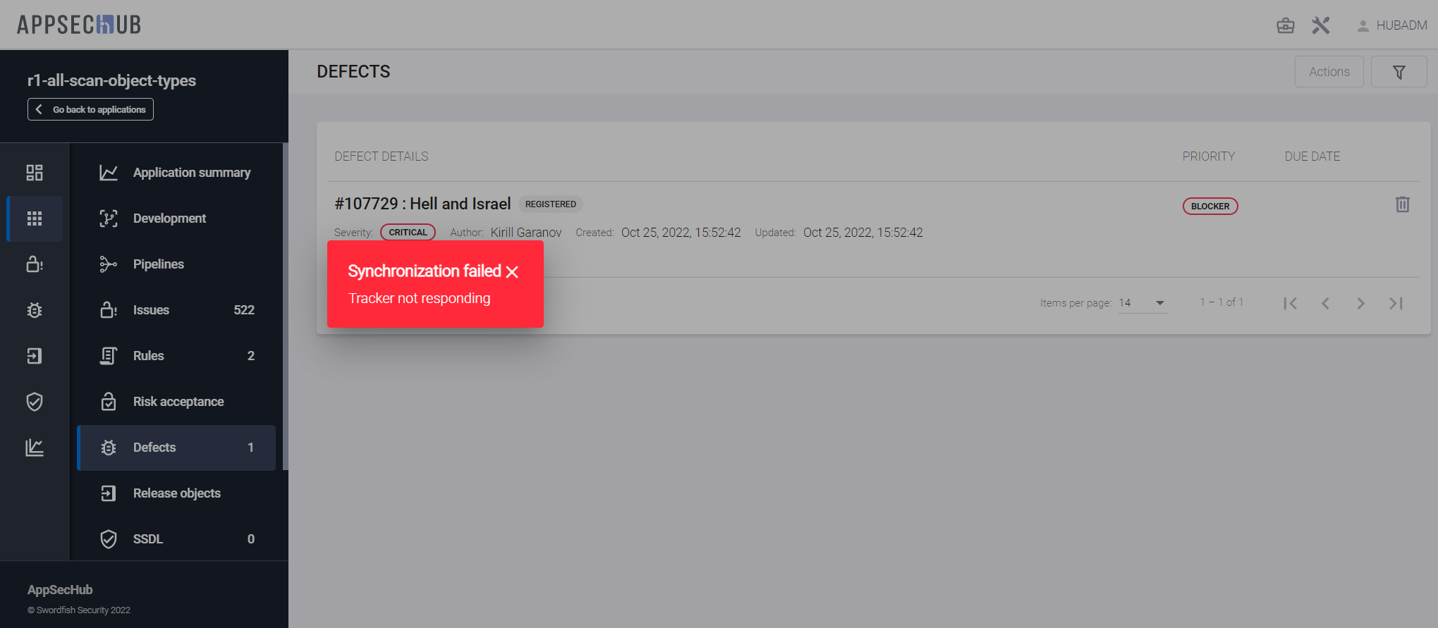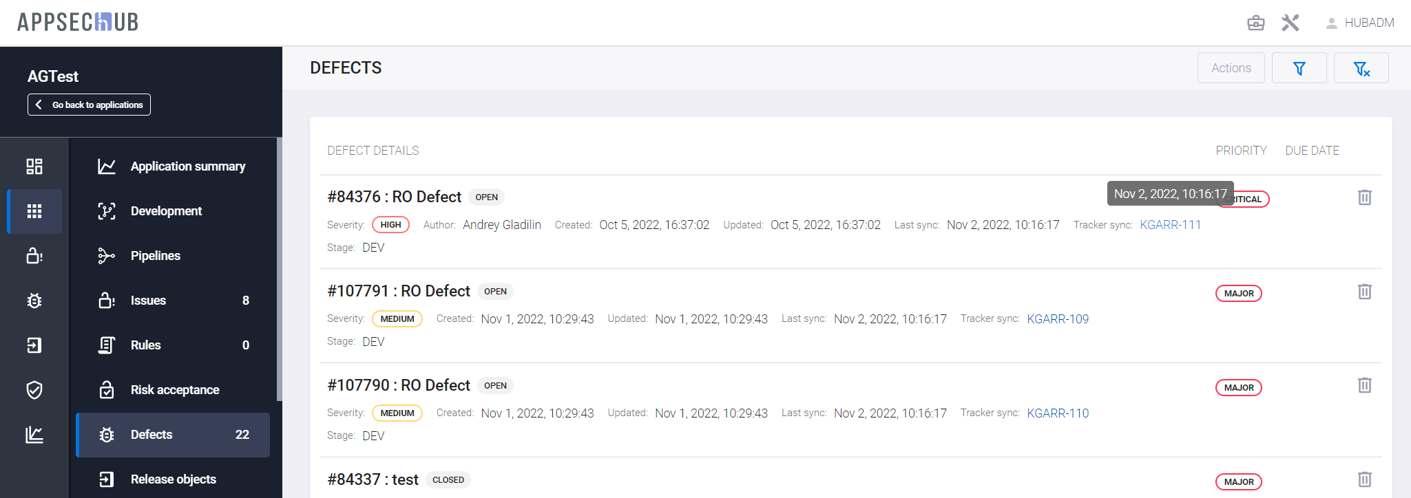 Предположим, что в AppSec.Hub был создан или обновлен один или несколько дефектов безопасности. Все вновь созданные или обновленные дефекты безопасности необходимо синхронизировать с проектной системой отслеживания дефектов (Jira или YouTrack).