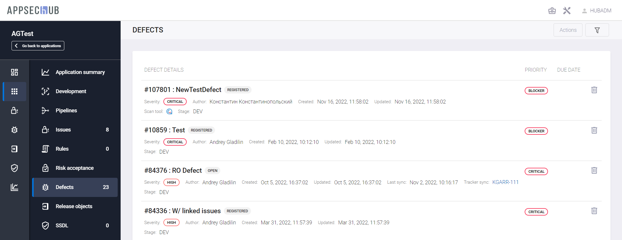 - Tracker sync — ссылка на дефект в проектной системе отслеживания дефектов, соответствующий дефекту в AppSec.Hub.