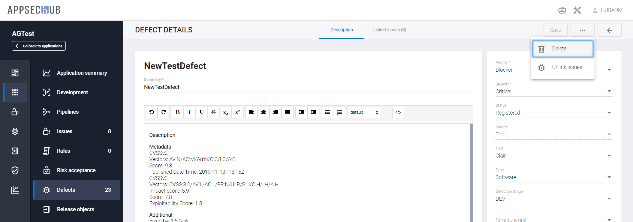 Предусмотрена возможность удаления созданного дефекта безопасности. Нажмите идентификатор выбранного дефекта #. На экране появится окно с подробной информацией о нем.