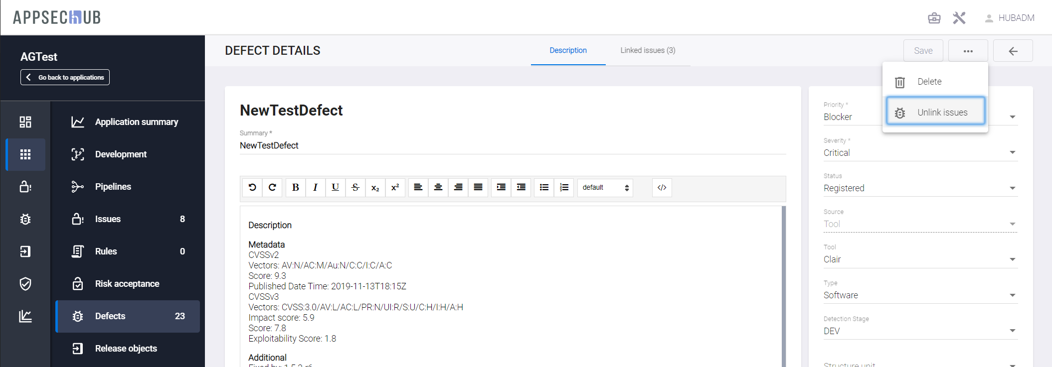 Предусмотрена возможность удаления из дефекта связанных с ним проблем безопасности. Открыв окно дефекта безопасности, нажмите кнопку Actions