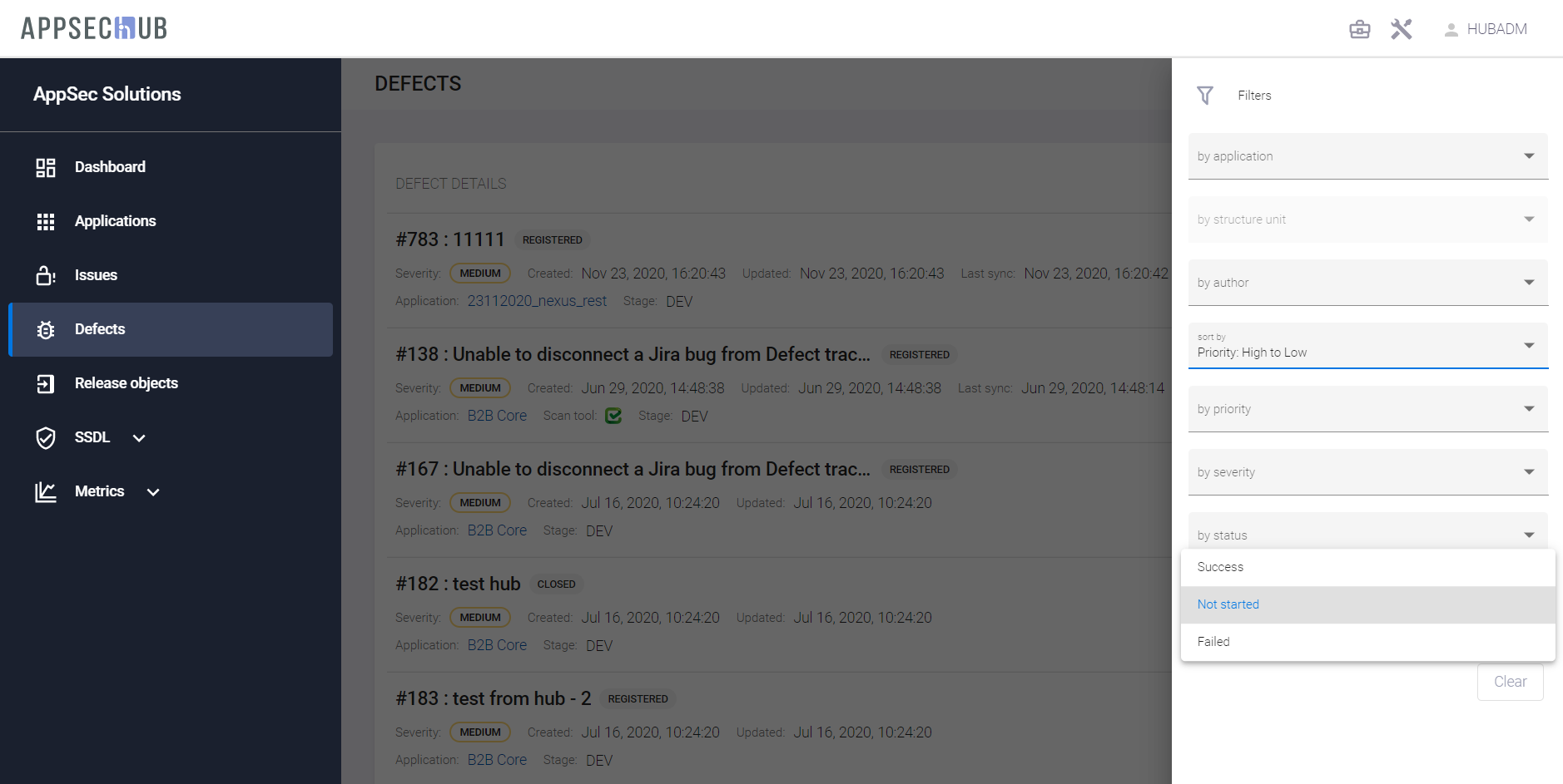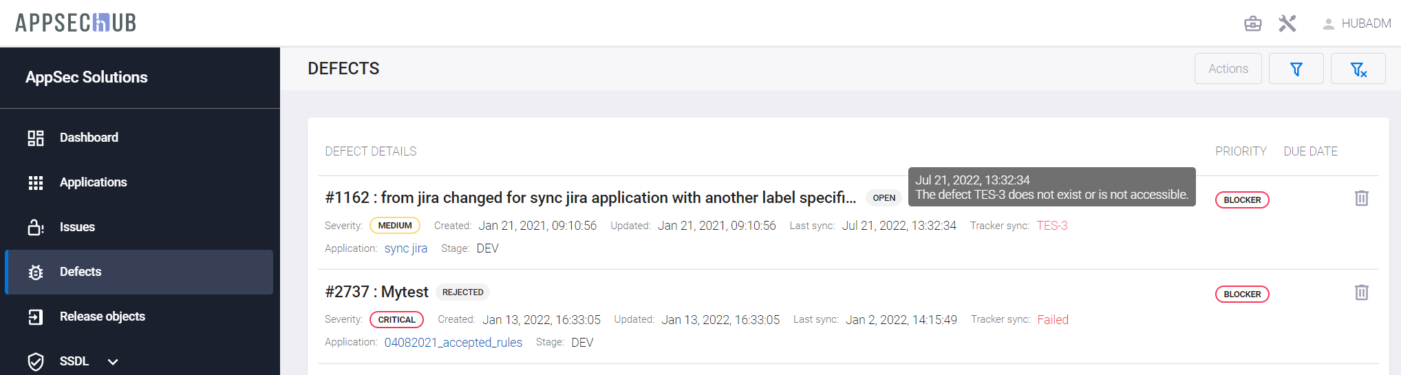 Дефекты безопасности были синхронизированы между AppSec.Hub и Jira. Обновленная информация о дефектах будет отображена на странице Defects.