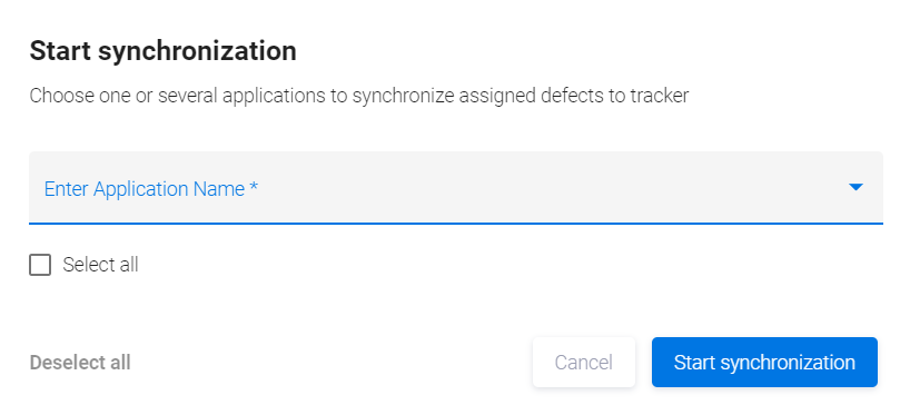 Чтобы синхронизировать дефекты для нескольких приложений, находясь на главном экране системы AppSec.Hub, выберите в меню пункт Defects. Нажмите кнопку Actions в правом верхнем углу и в выпадающем меню выберите пункт Sync with tracker. На экране появится окно Start synchronization.