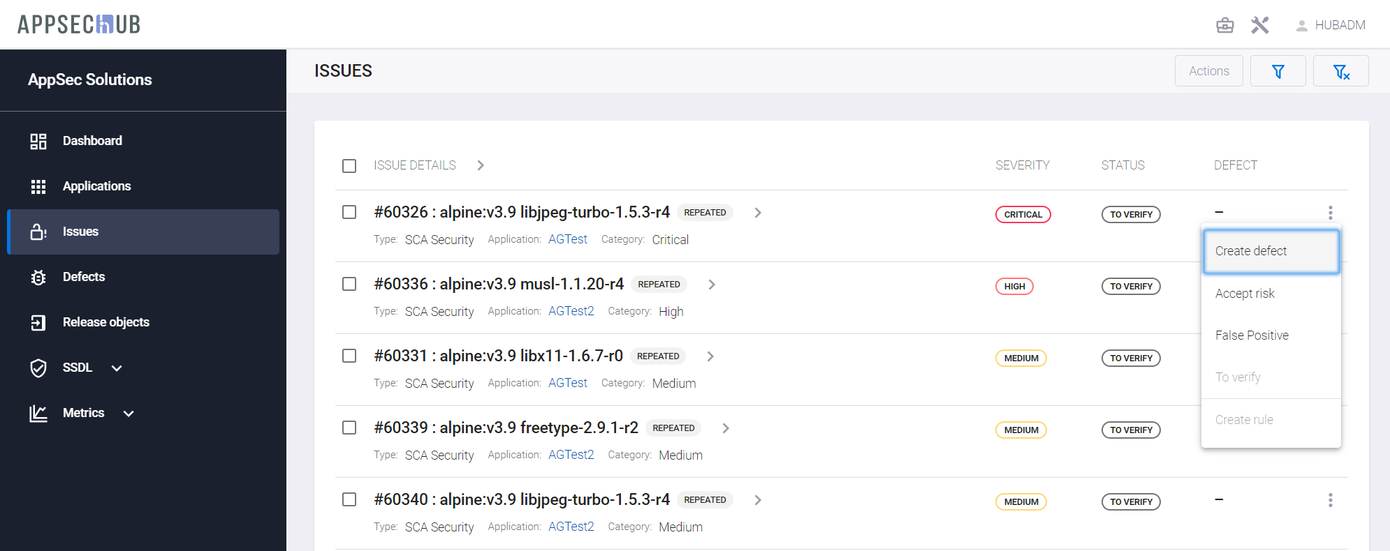 Создать дефект безопасности на основе проблем безопасности можно либо на общей странице проблем безопасности Issues, либо на странице приложения. Чтобы создать дефект на странице приложения, необходимо предварительно выбрать приложение, а затем нажать пункт меню Issues.