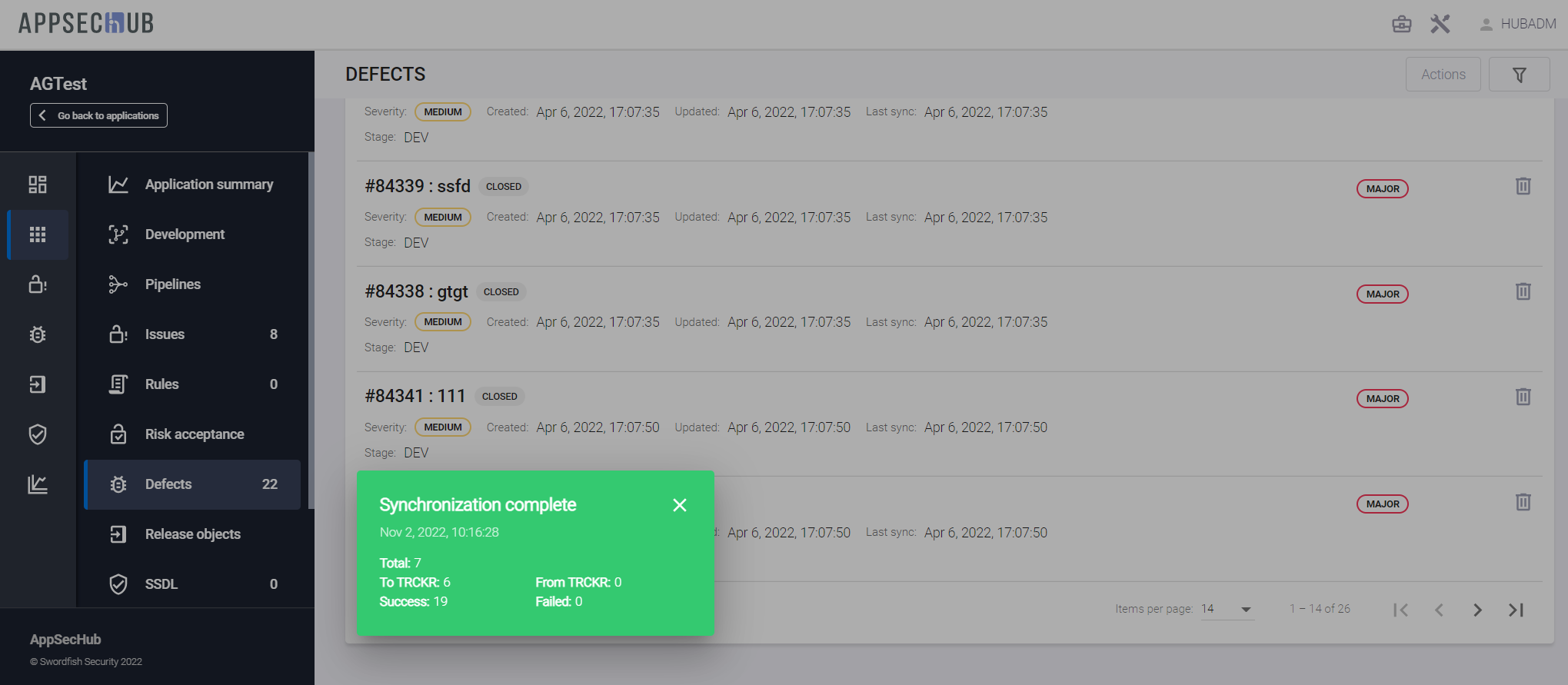 Подождите, пока процесс синхронизации будет успешно завершен. Теперь статус дефекта безопасности в AppSec.Hub должен получить значение Fixed, как и в Jira.