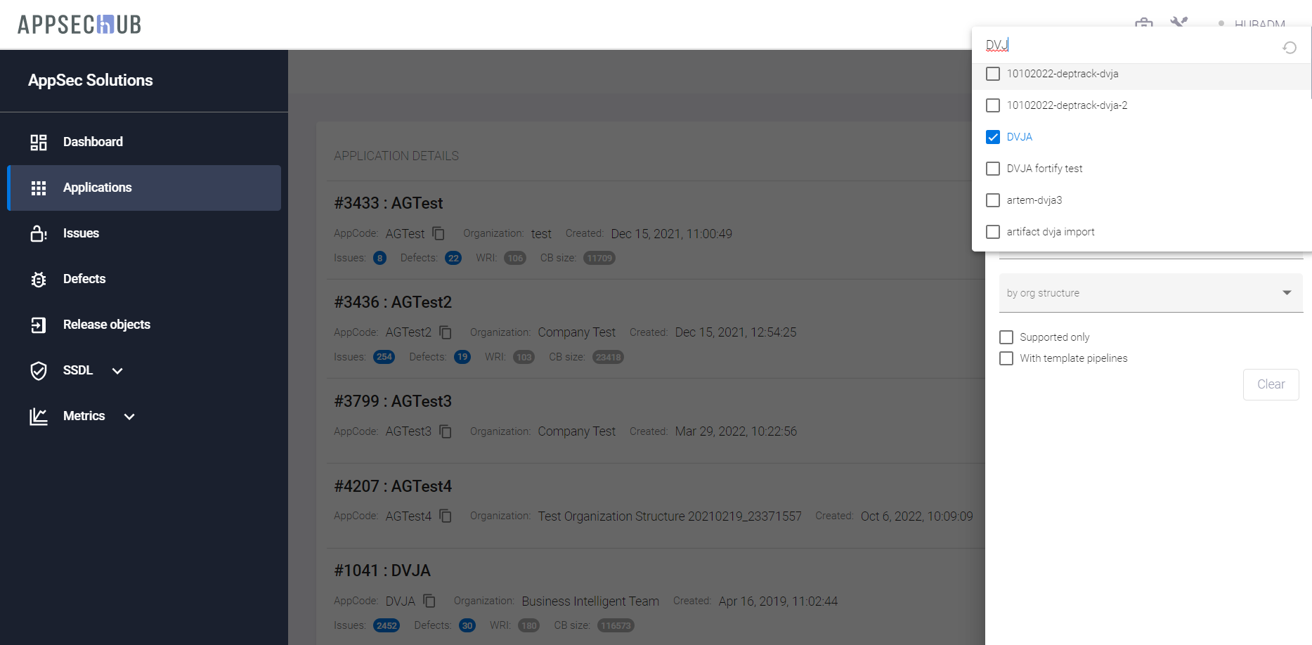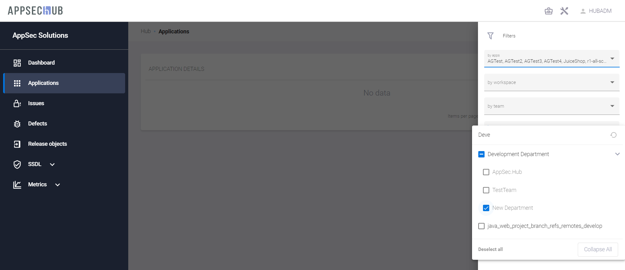 Чтобы начать работу с приложениями, выберите в меню пункт Applications. На экране появится страница приложений AppSec.Hub.