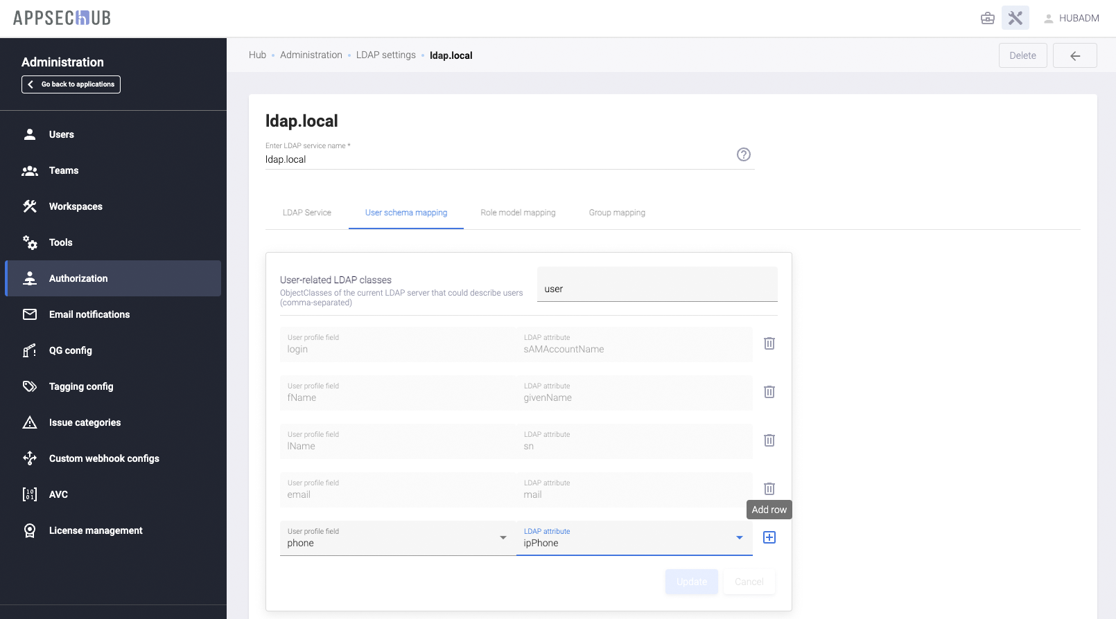 При каждой авторизации пользователя происходит обновление информации о нем в AppSec.Hub в соответствии с настроенными сопоставлениями схемы пользователя, ролевой модели и групп. Таким образом, изменение информации о пользователе в LDAP-сервисе оперативно находит свое отражение в AppSec.Hub.