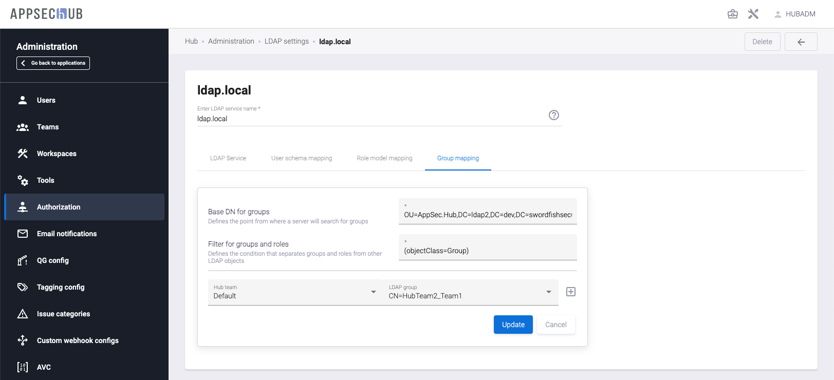 В появившихся полях попарно сопоставьте роли AppSec.Hub (Hub role) с группами LDAP (LDAP group).