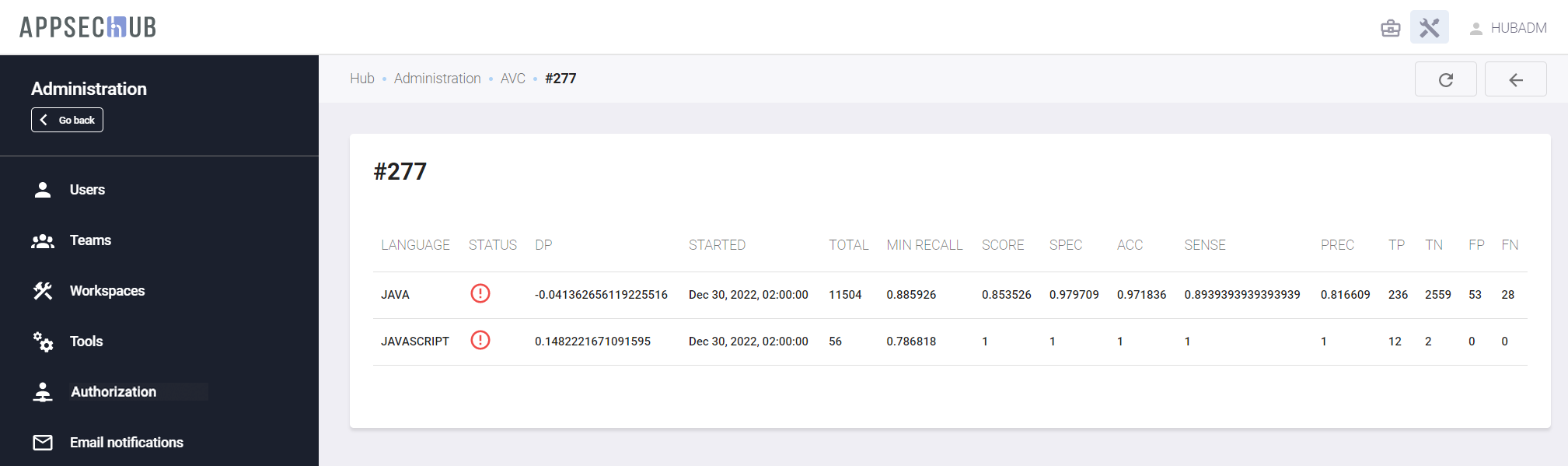 Вкладка AVC History содержит историю изменений настроек AVC-модели с точки зрения обучения (active learning) этой модели. Период тренировки AVC-модели задается в конфигурационном файле app.properties (см. раздел «Приложение 4. Конфигурационный файл app.properties»). По умолчанию, период переобучения составляет одни сутки.