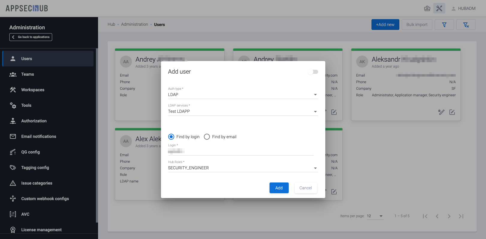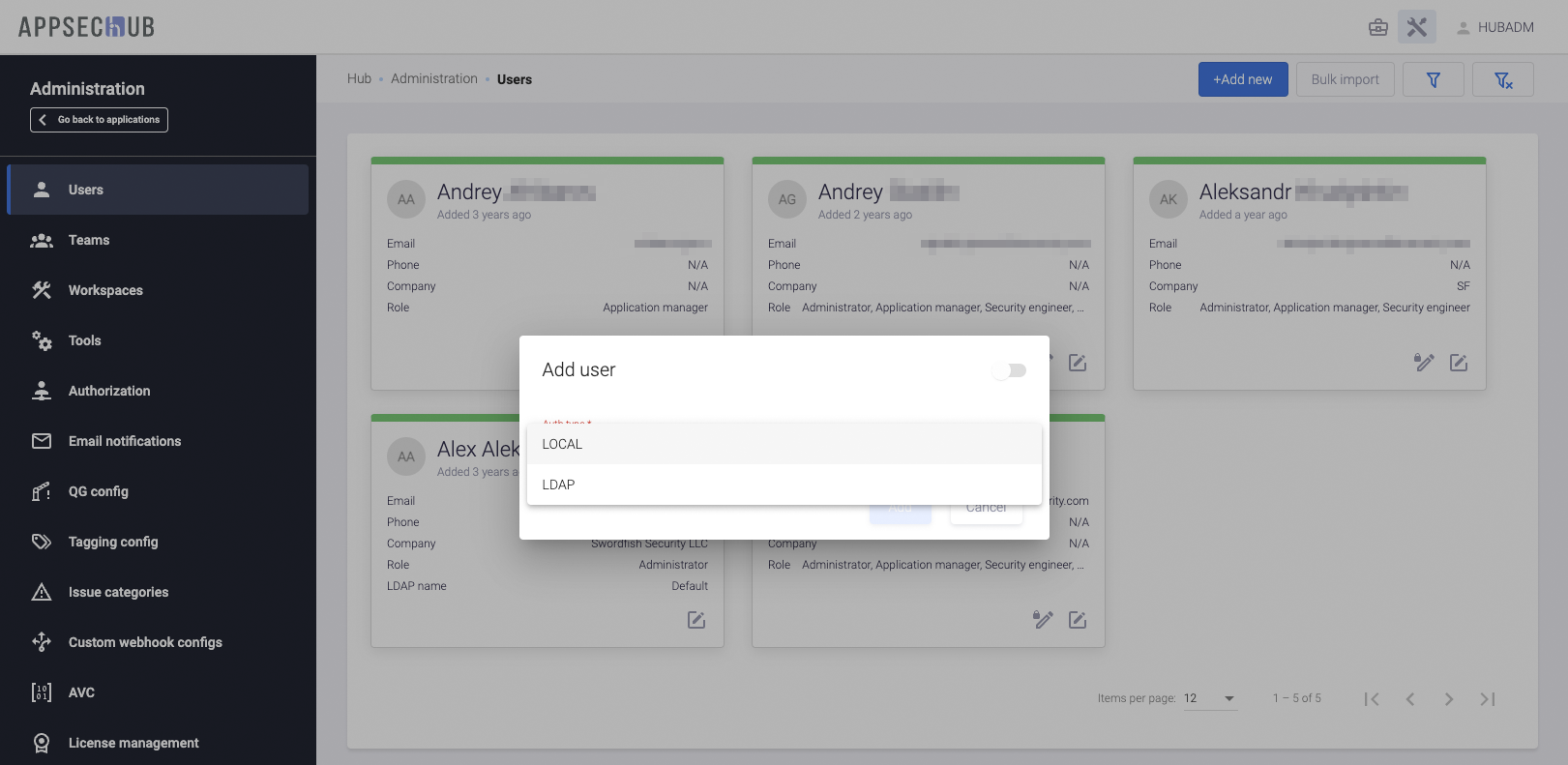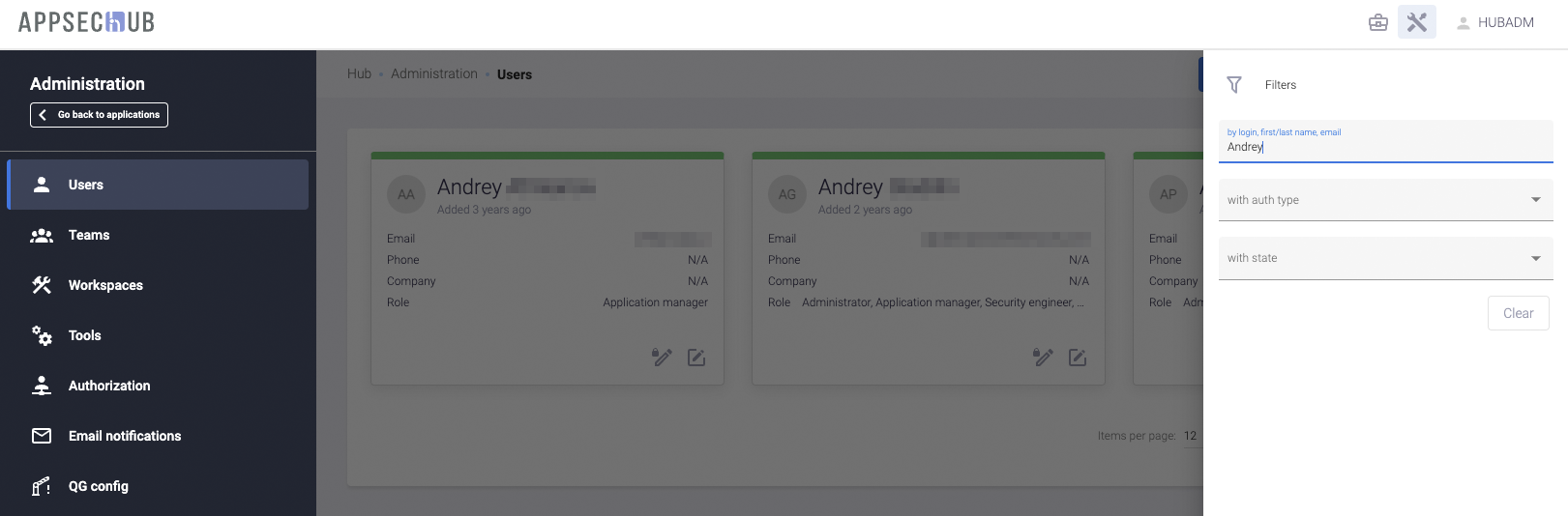 Можно фильтровать пользователей по типу авторизации — Local (AppSec.Hub)/LDAP/SSO (with auth type) или по состоянию — активные/пассивные (with state).