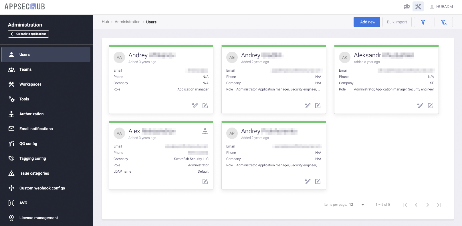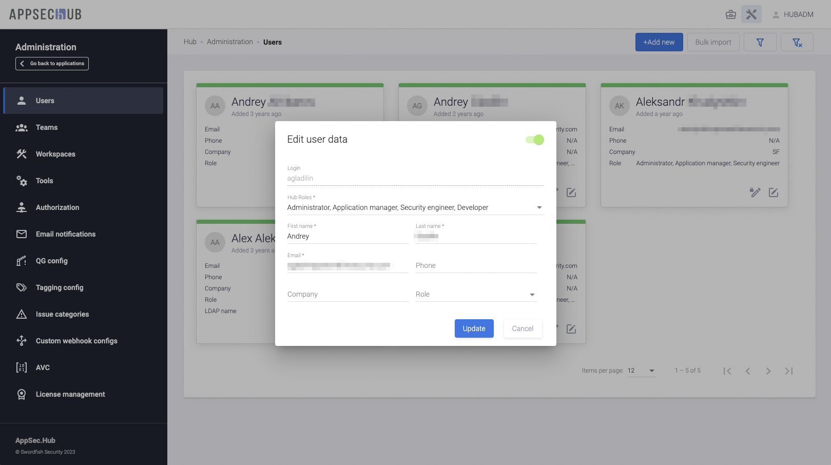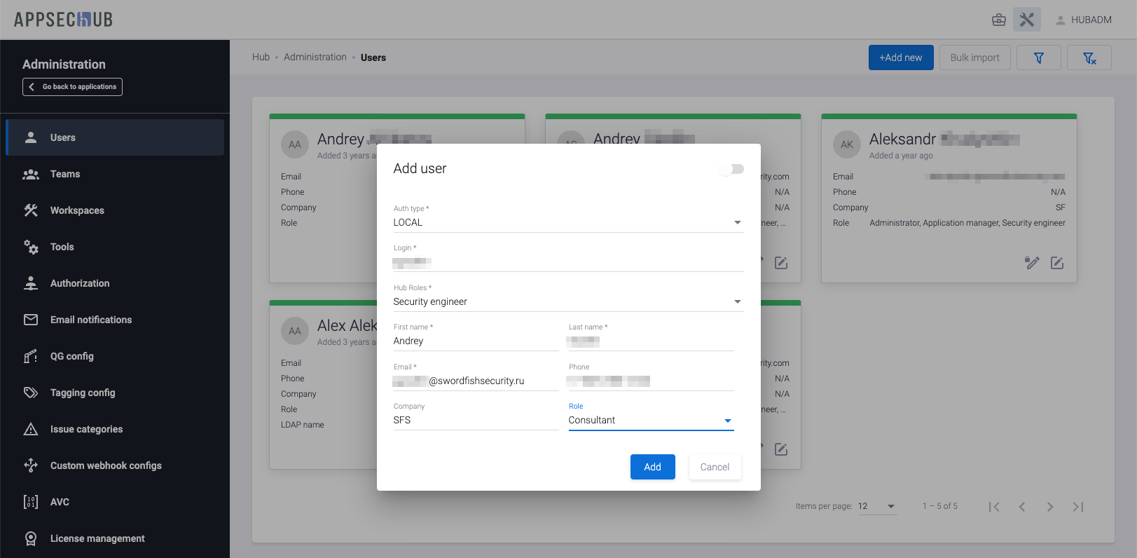 Можно фильтровать пользователей по типу авторизации — Local (AppSec.Hub)/LDAP/SSO (with auth type) или по состоянию — активные/пассивные (with state).
