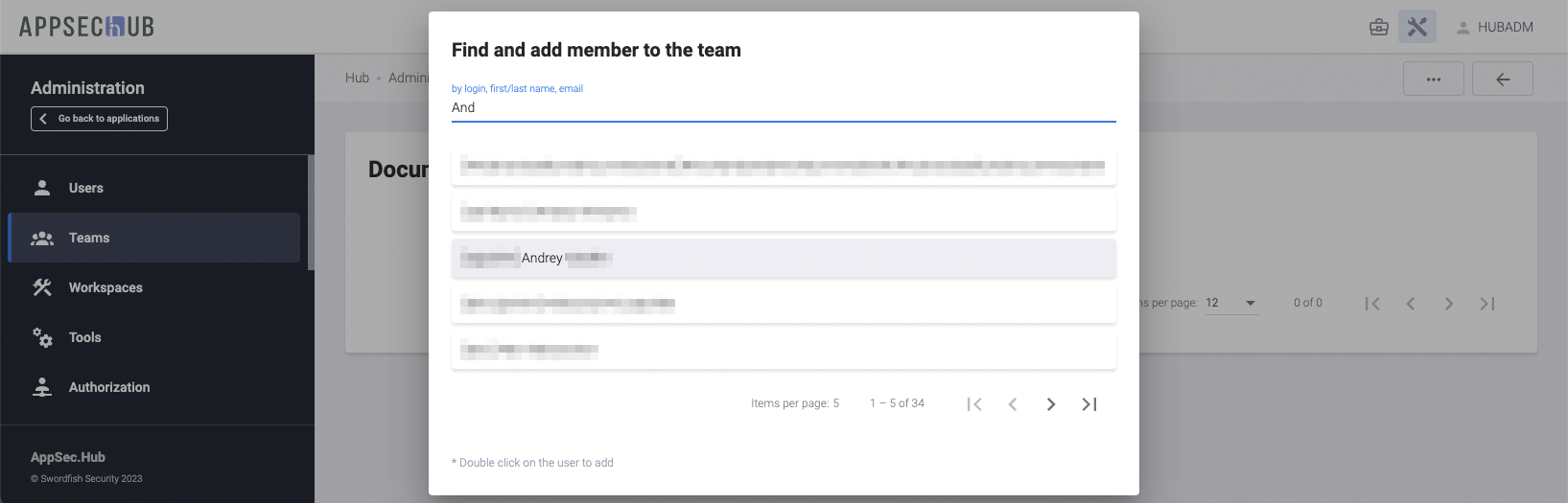В окне Find and add member to the team дважды нажмите на имя пользователя из списка существующих, чтобы добавить его в команду.