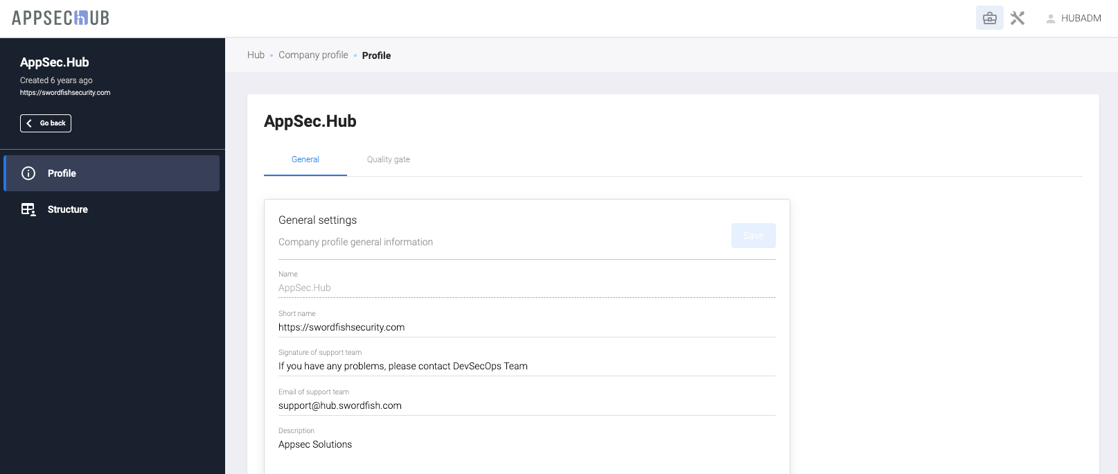 Пункт меню Profile, вкладка General: профиль организации, включая название компании, URL сайта компании, адрес службы поддержки и краткое описание компании. Заметим, что информация, указанная в полях Signature of support team и Email of support team, отображается при завершении скриптов, которые используются для автоматической интеграции AppSec.Hub в единый цикл разработки программного обеспечения. Более подробная информация об автоматической интеграции приведена в разделе «Onboarding» Руководства пользователя, а примеры завершающих сообщений в CLI можно посмотреть в «Приложении 7. Результаты сканирования» Руководства по установке и интеграции.