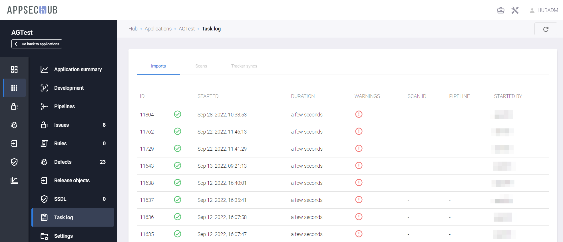 - STARTED BY — имя пользователя, инициировавшего процесс импорта Security Issues. Если импорт был запущен автоматический, например после завершения сканирования, в данном поле отображается значение «auto».