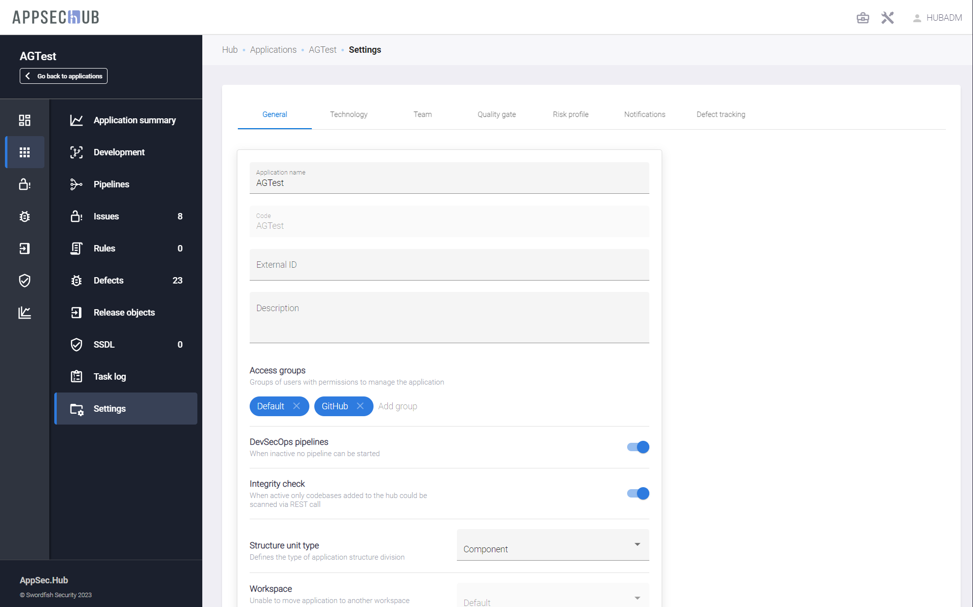 - DevSecOps pipelines — если этот переключатель выключен, security pipelines для этого приложения не могут быть запущены.