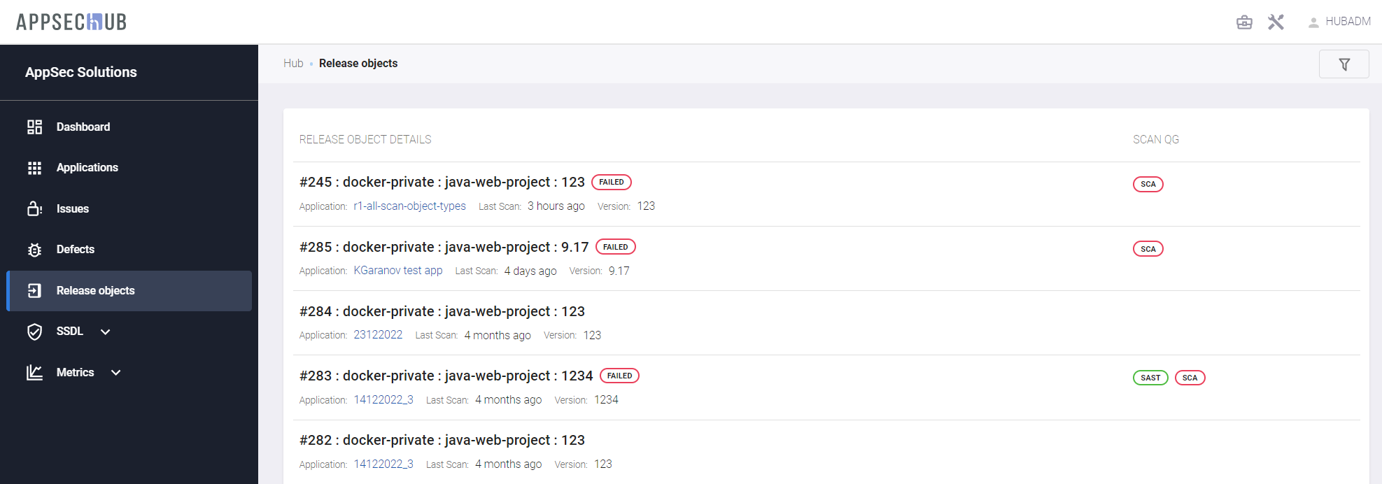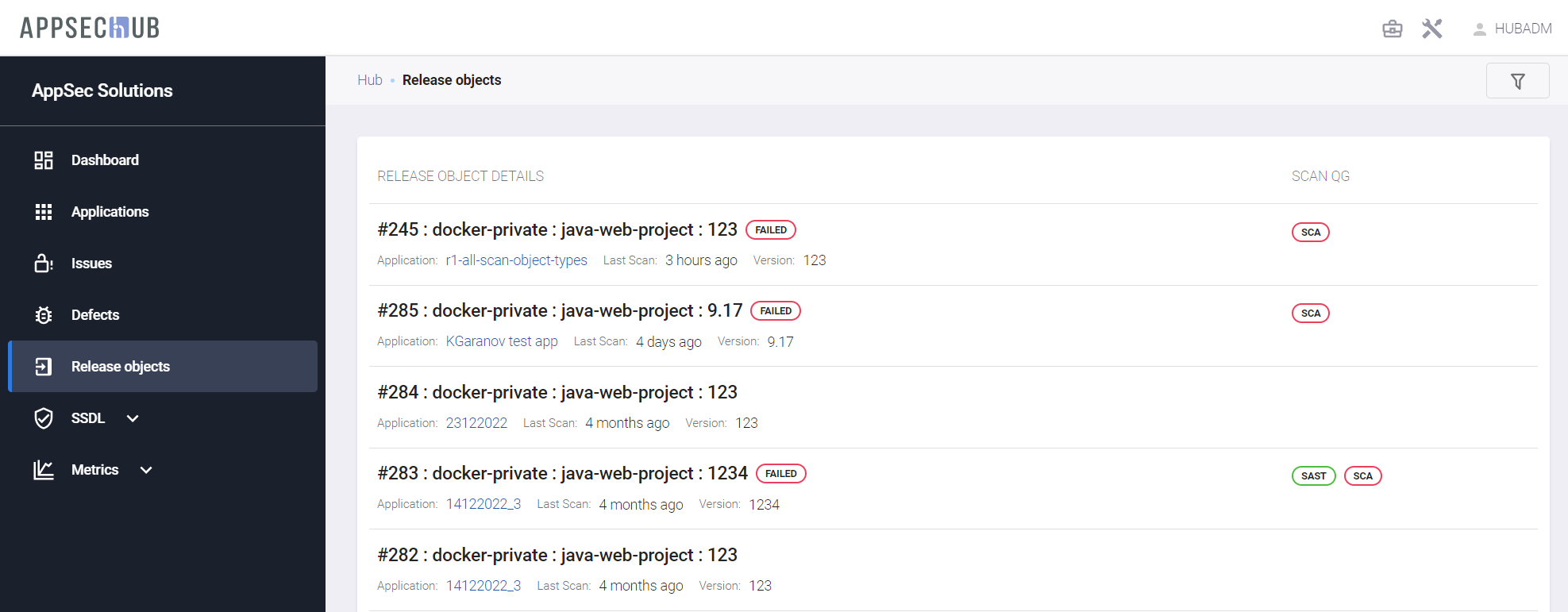 Чтобы начать работу с релизными объектами, выберите в меню пункт Release objects. На экране появится страница со всеми релизными объектами различных приложений, доступных данному пользователю. Релизные объекты могут просматривать все пользователи независимо от их роли в AppSec.Hub.