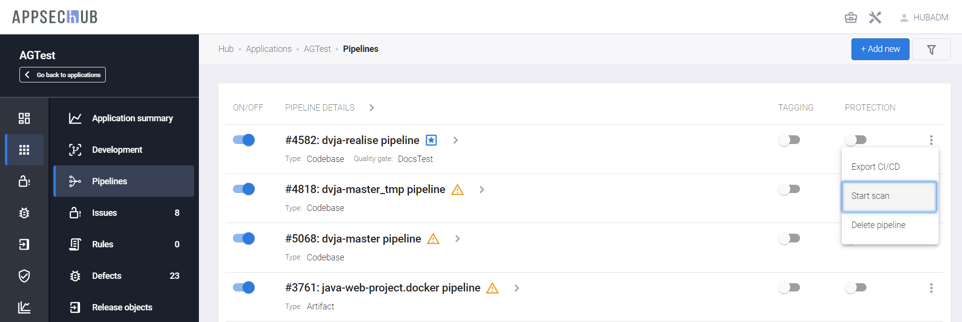 Релизные объекты создаются в процессе сканирования. На странице приложения выберите пункт меню Pipelines в меню слева и выберите security pipeline того объекта, сканирование которого будет привязано к создаваемому релизному объекту, например, пайплайн кодовой базы.