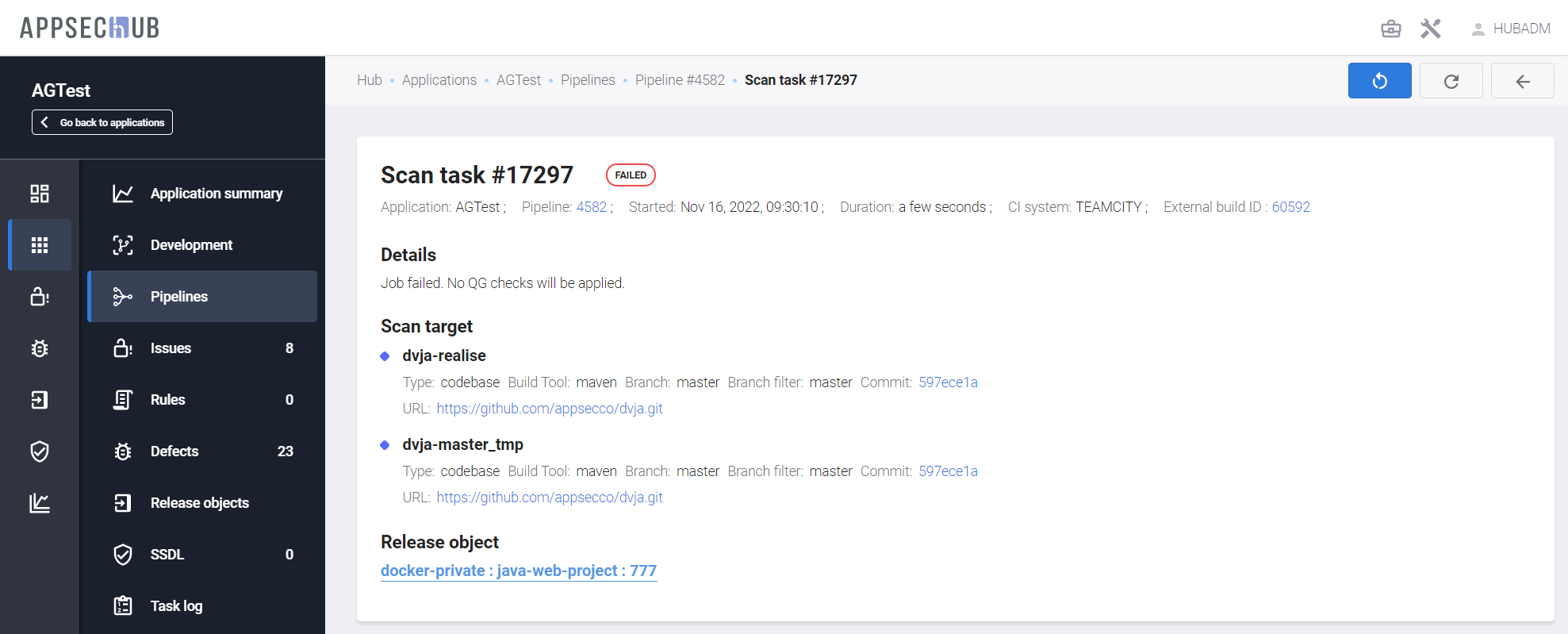 Чтобы убедиться в том, что это сканирование привязано к созданному релизному объекту, нажмите идентификатор пайплайна.