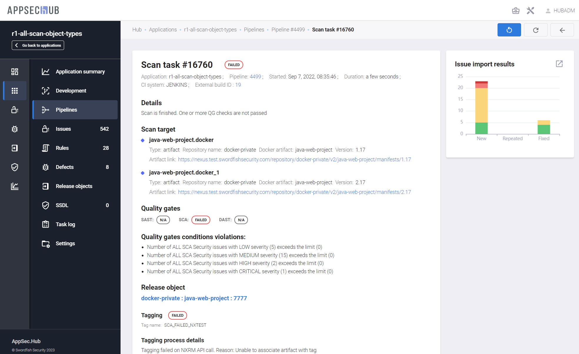 - Если хотя бы одно сканирование завершились неуспешно и отмечено красным цветом, сканирование релизного объекта имеет статус FAILED.