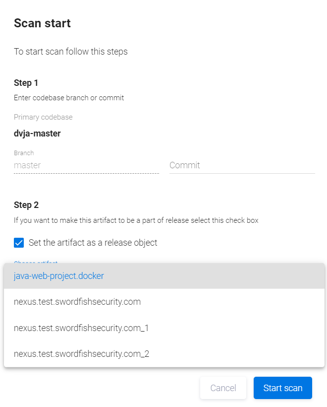 В появившемся окне Scan start в секции Step 2 отметьте галочкой поле Set the artifact as a release object. Выберите существующий артефакт данного приложения из выпадающего списка в поле Choose artifact, чтобы привязать нему сканирование и сделать его релизным объектом. В поле Artifact version укажите версию создаваемого релизного объекта и версию билда в поле Build version (если применимо, это зависит от типа релизного объекта — обязательные поля отмечены звездочкой).