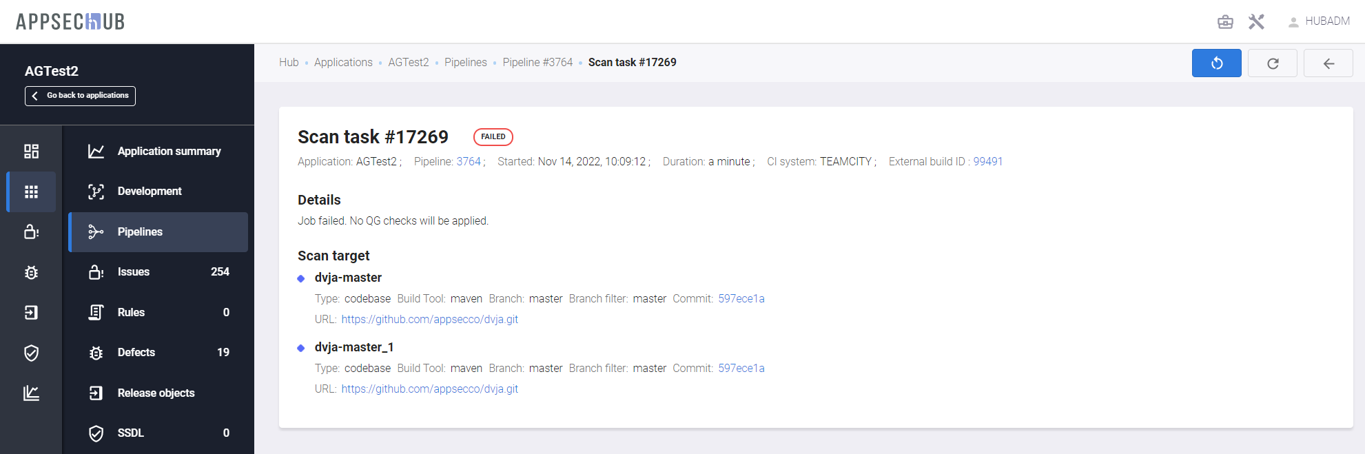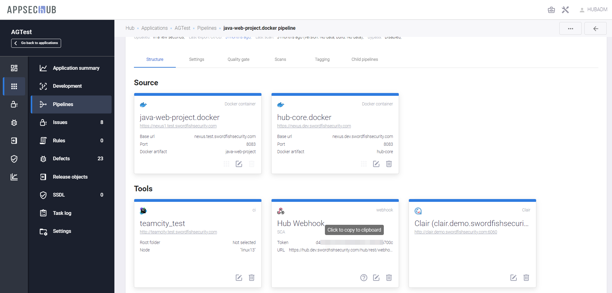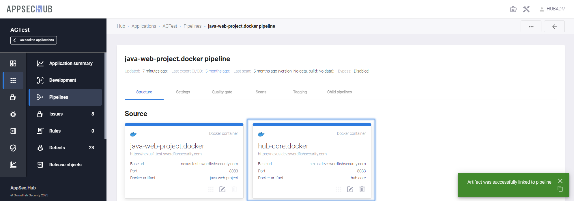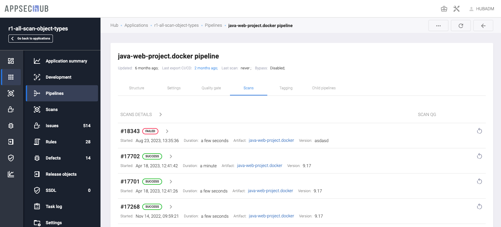 С точки зрения безопасности приложения, каждый артефакт можно просканировать, чтобы найти проблемы информационной безопасности. AppSec.Hub автоматизирует этот процесс и поддерживает DevSecOps пайплайны артефактов. Выберите пункт меню Pipelines в консоли слева и нажмите идентификатор пайплайна артефакта (имеющего значение Artifact в поле Type), чтобы просмотреть подробную информацию о нем.