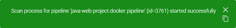 .При запуске такого Security Pipeline в правом нижнем углу пользовательского интерфейса отображается подтверждающее уведомление, но фактически сканирования не выполняется и в истории сканирования (вкладка Scans) отображается соответствующее предупреждение.