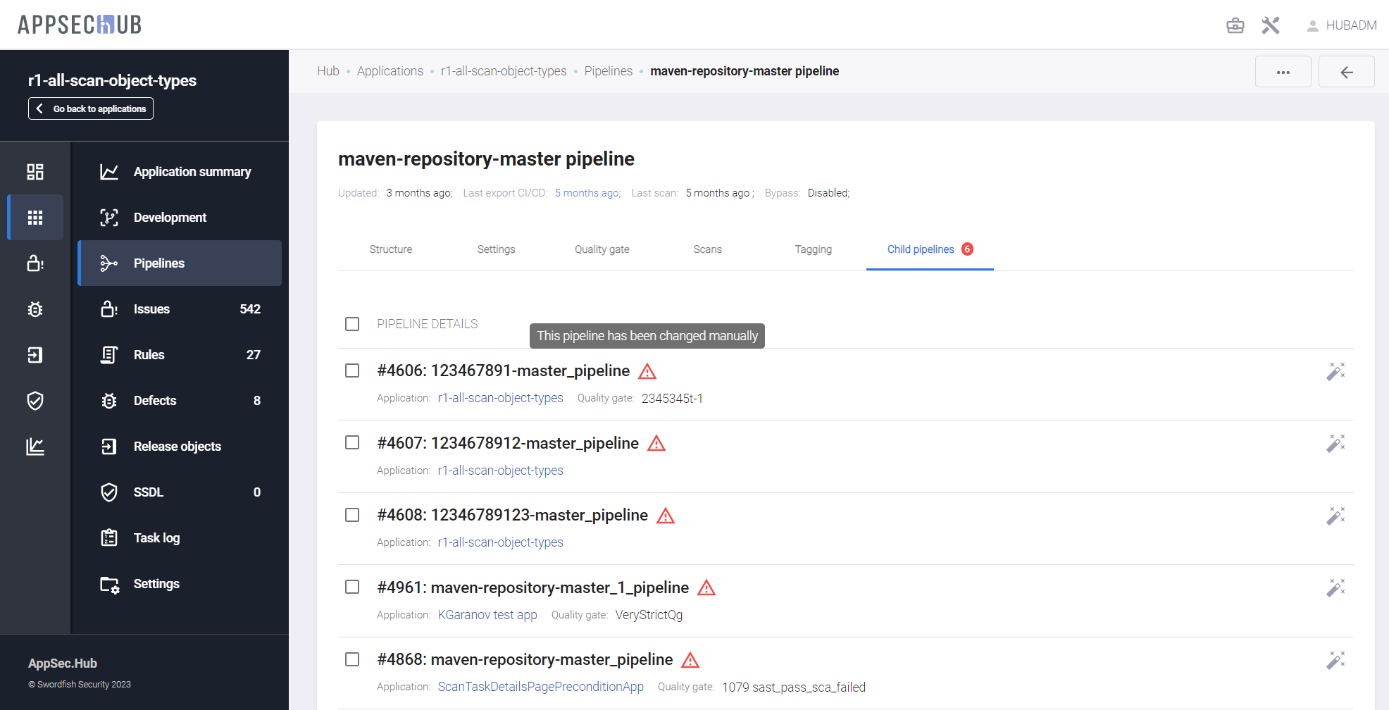 Использование пайплайна в качестве шаблона позволяет управлять набором инструментов сканирования во всех дочерних пайплайнах. Таким образом можно, например, заменить или добавить инструмент сканирования в пайплайне-шаблоне, и эти изменения будут автоматически применены ко всем дочерним пайплайнам. Исключением являются дочерние пайплайны, в которых после их создания по шаблону были вручную произведены изменения, из-за которых в данный момент эти дочерние пайплайны отличаются от пайплайна-шаблона. К таким изменениям относится удаление, замена или добавление сканирующего инструмента в дочернем пайплайне. Изменения только в настройках сканирующего инструмента без изменений в составе включенных в пайплайн инструментов не являются основанием для занесения такого пайплайна в число измененных вручную «проблемных» дочерних пайплайнов. При обновлении пайплайна-шаблона автоматическое обновление ранее измененного вручную дочернего пайплайна может привести к потере внесенных в него изменений, поэтому изменения в пайплайне-шаблоне не будут автоматически применяться к таким дочерним пайплайнам. В этом случае необходимо выполнить ручные шаги, описанные ниже.