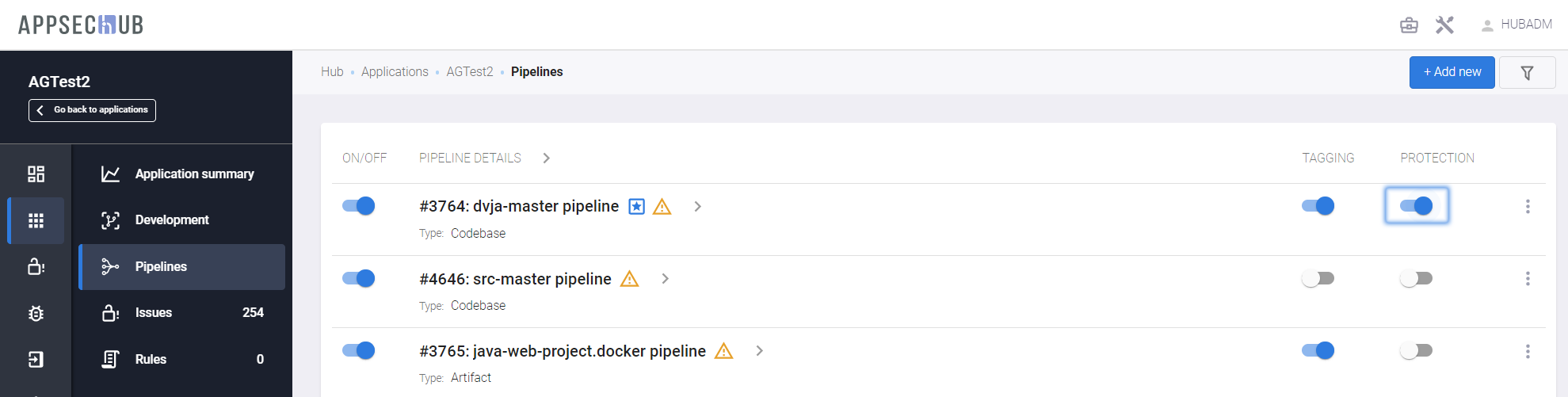 - Pipeline activity — если этот переключатель выключен, Security Pipeline не может быть запущена на сканирование. Состояние этой настройки пайплайна в AppSec.Hub отображается на странице PIPELINES с помощью переключателя пайплайна (ON/OFF). Если переключатель выключен и имеет серый цвет, Security Pipeline не может быть запущена на сканирование. Если переключатель включен и имеет синий цвет, Security Pipeline может быть запущена на сканирование.