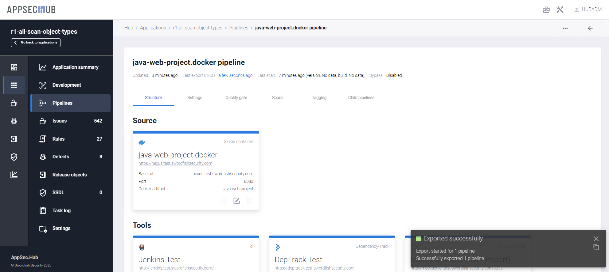 После того как все компоненты DevSecOps пайплайна артефактов настроены и пайплайн был экспортирован, нажмите кнопку Actions