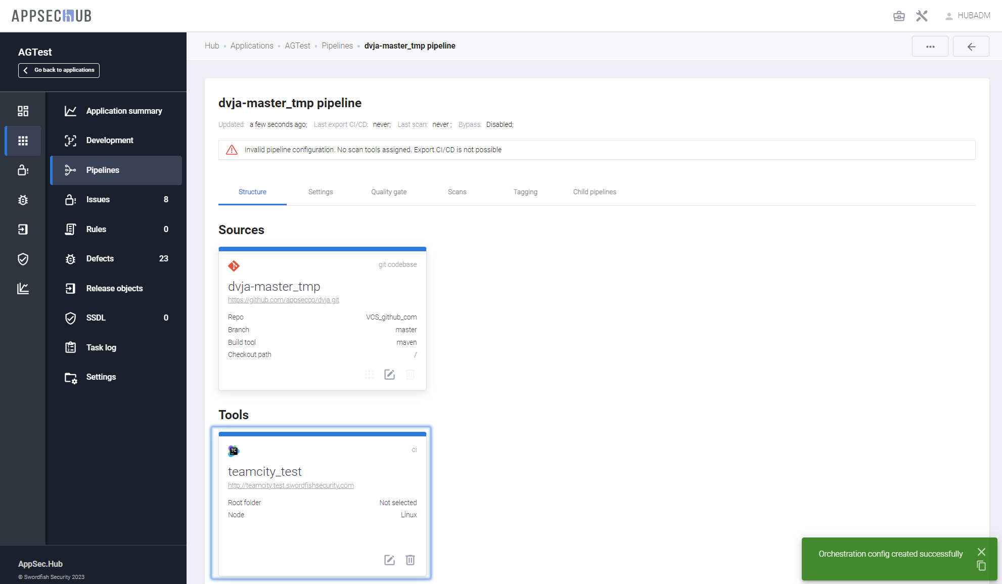 На этой странице выведены два предупреждения о том, что инструмент оркестрации и инструмент сканирования еще не добавлены в пайплайн.