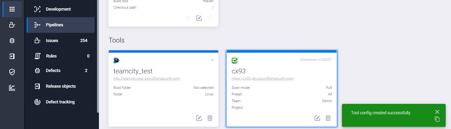 на карточке инструмента, включая метку узла, как в случае с Security Pipeline артефактов.