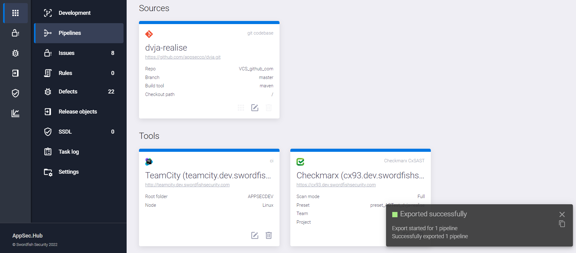 CI/CD overwrite protection — этот переключатель блокирует экспорт Security Pipeline в CI/CD инструмент с помощью пункта меню Export CI/CD. Это позволяет защитить настройки Security Pipeline от нежелательной перезаписи. В списке пайплайнов приложения состояние этого переключателя дублируется состоянием переключателя PROTECTION.