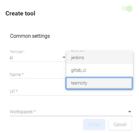 В появившемся окне Create tool выберите элемент ci из выпадающего меню в поле Tool type и элемент teamcity из выпадающего меню в поле Product.