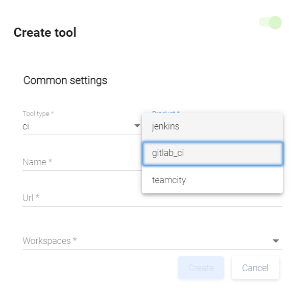 В появившемся окне Create tool выберите ci в поле Tool type и gitlab_ci в поле Product.