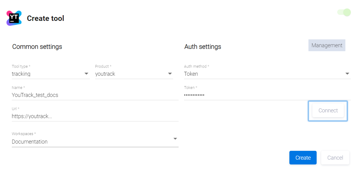 В этом окне определите следующие параметры для подключаемого инструмента YouTrack: