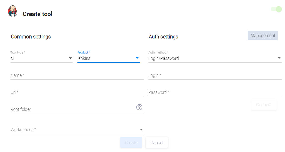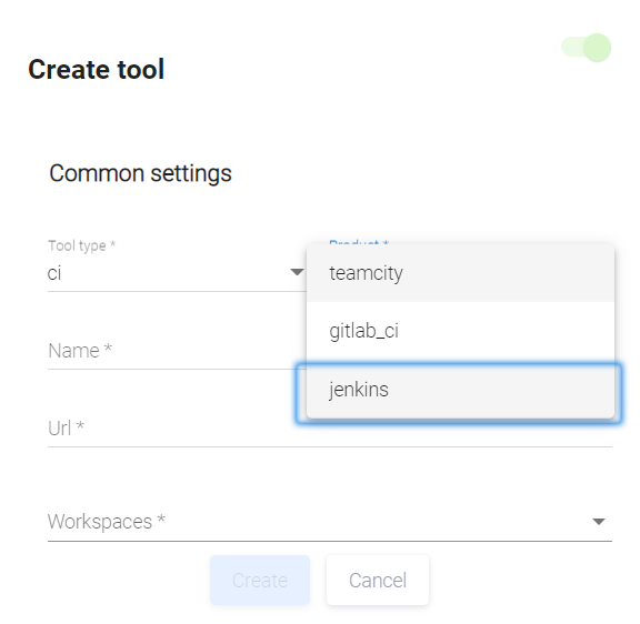 В появившемся окне Create tool выберите ci в поле Tool type и jenkins в поле Product.