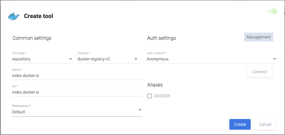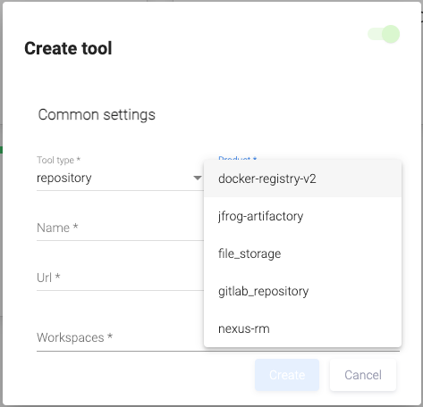 В открывшемся окне Create tool выберите элемент repository из выпадающего меню в поле Tool type и элемент docker-registry-v2 в поле Product.