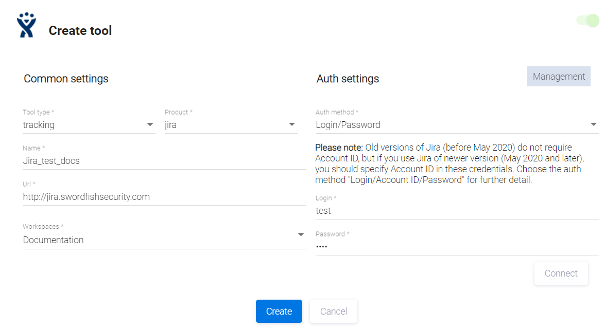 В появившемся окне Create tool выберите элемент tracking из выпадающего меню в поле Tool type и элемент jira из выпадающего меню в поле Product.
