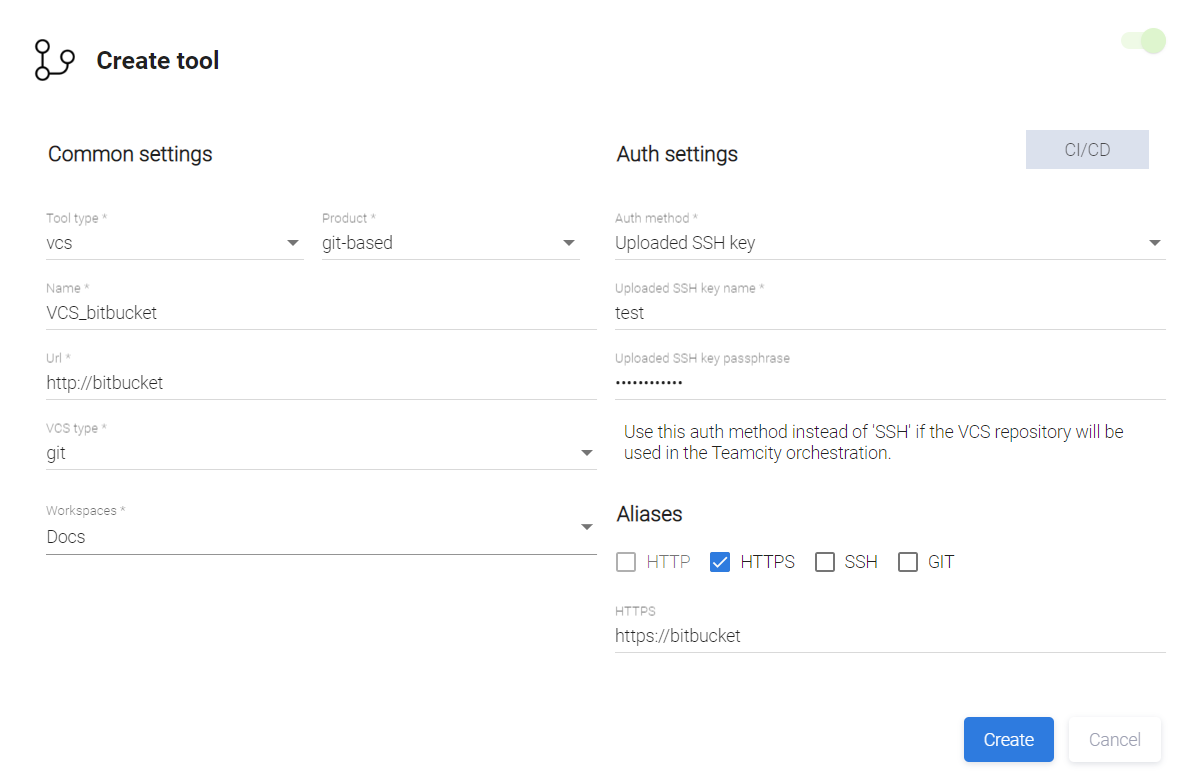 В открывшемся окне Create tool выберите элемент vcs из выпадающего меню в поле Tool type и элемент git-based в поле Product.