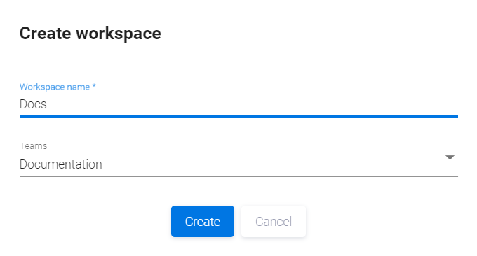 Для создания нового рабочего пространства нажмите кнопку +Add new. В появившемся диалоговом окне Create workspace укажите наименование создаваемого рабочего пространства и выберите команды, которые смогут работать в этом рабочем пространстве.