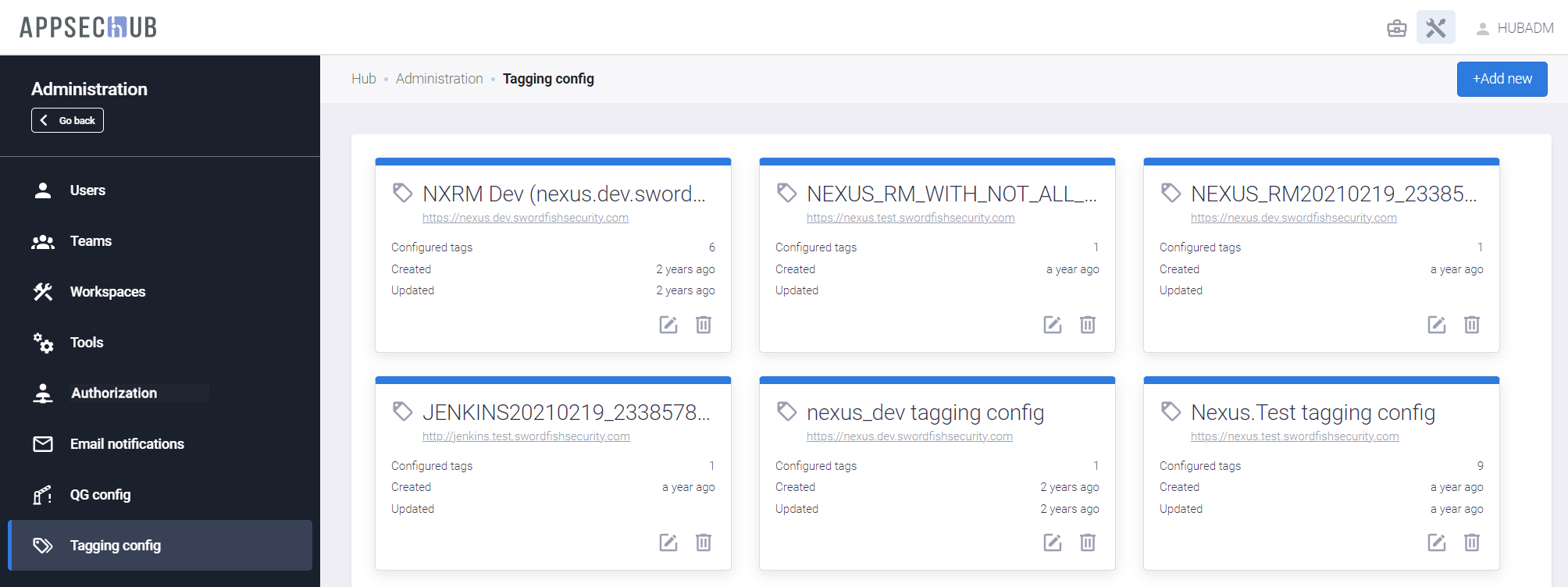 Если на этой странице еще не существует карточек конфигурации тегирования для нужного типа инструмента, нажмите кнопку +Add new в верхнем правом углу страницы Tagging Config, чтобы определить параметры тегирования. На экране появится окно Create tagging config.