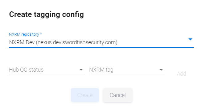 Выберите NXRM repository из выпадающего списка и во вновь появившихся полях Hub QG status и NXRM tag попарно сопоставьте статусы QG и теги репозитория. Чтобы сопоставить такую пару, кликните поле Hub QG status и выберите статус QG из выпадающего списка. Затем кликните поле NXRM tag и выберите тег репозитория из выпадающего списка.