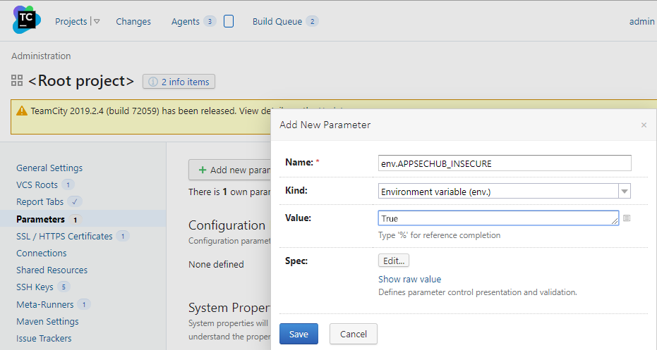 APPSECHUB_INSECURE, нажав Add new Parameter, и укажите значениеTrue(не валидировать SSL-сертификаты).
