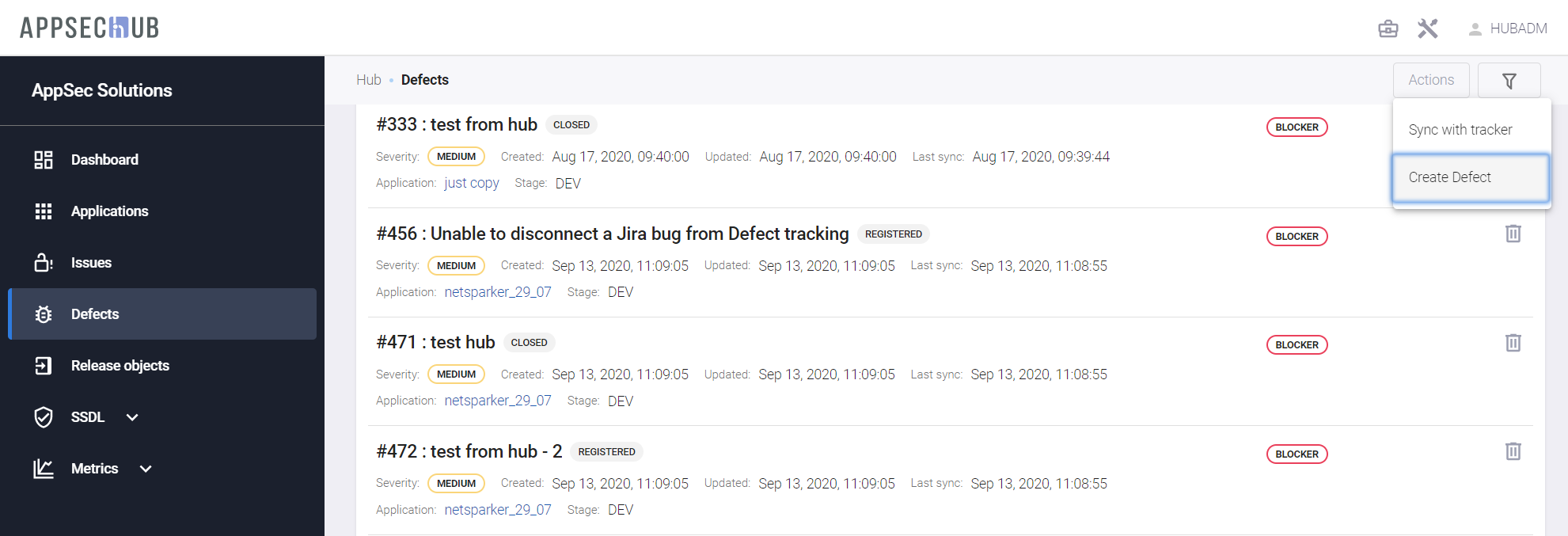 Как было описано в предыдущем разделе, выберите приложение и нажмите пункт меню Defects. На экране появится страница дефектов приложения. Нажмите кнопку Actions в правом верхнем углу и в выпадающем меню выберите пункт Sync with tracker.