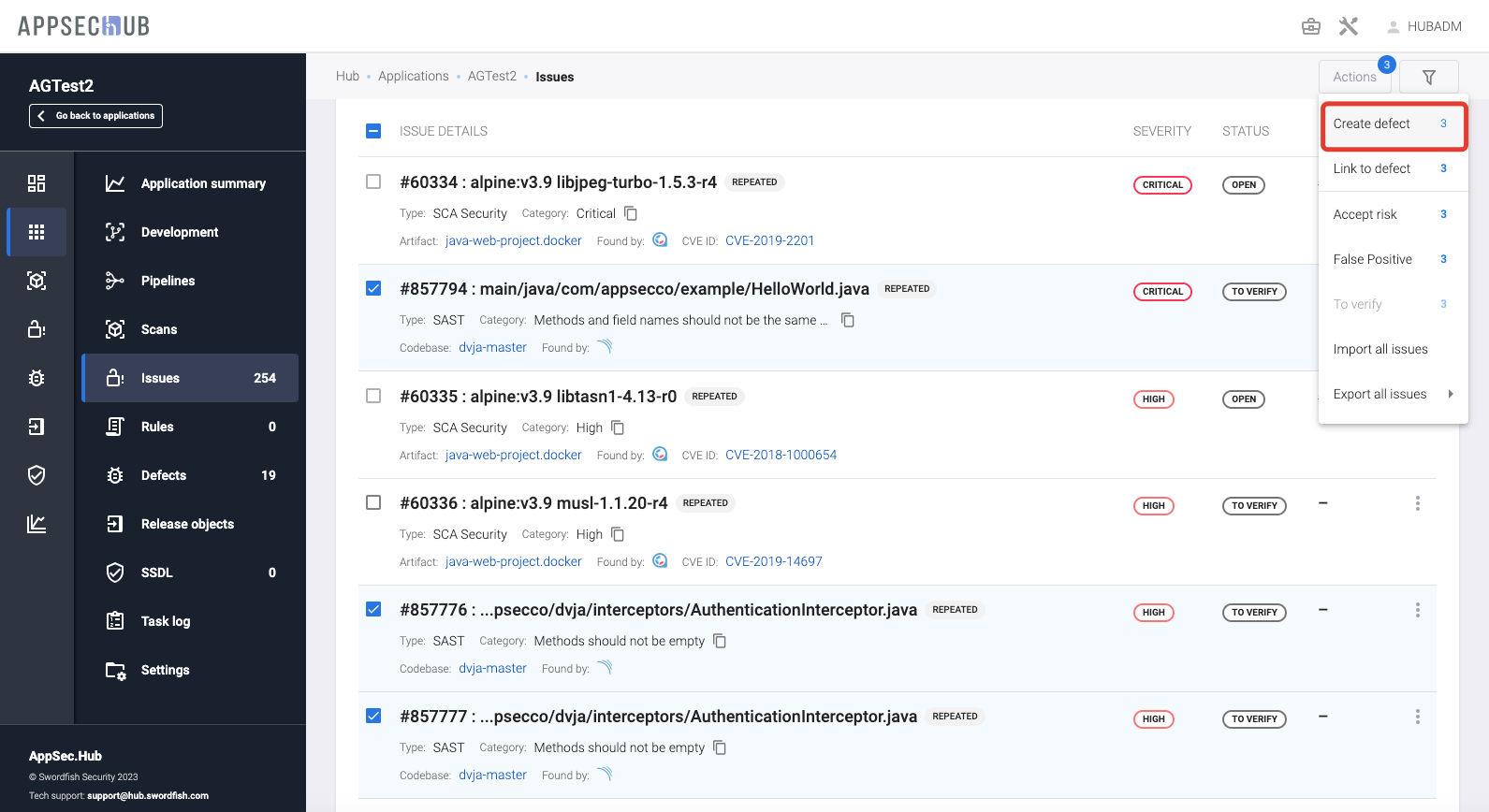Нажмите кнопку Actions в правом верхнем углу и в выпадающем меню выберите пункт Create defect, чтобы создать новый дефект безопасности.