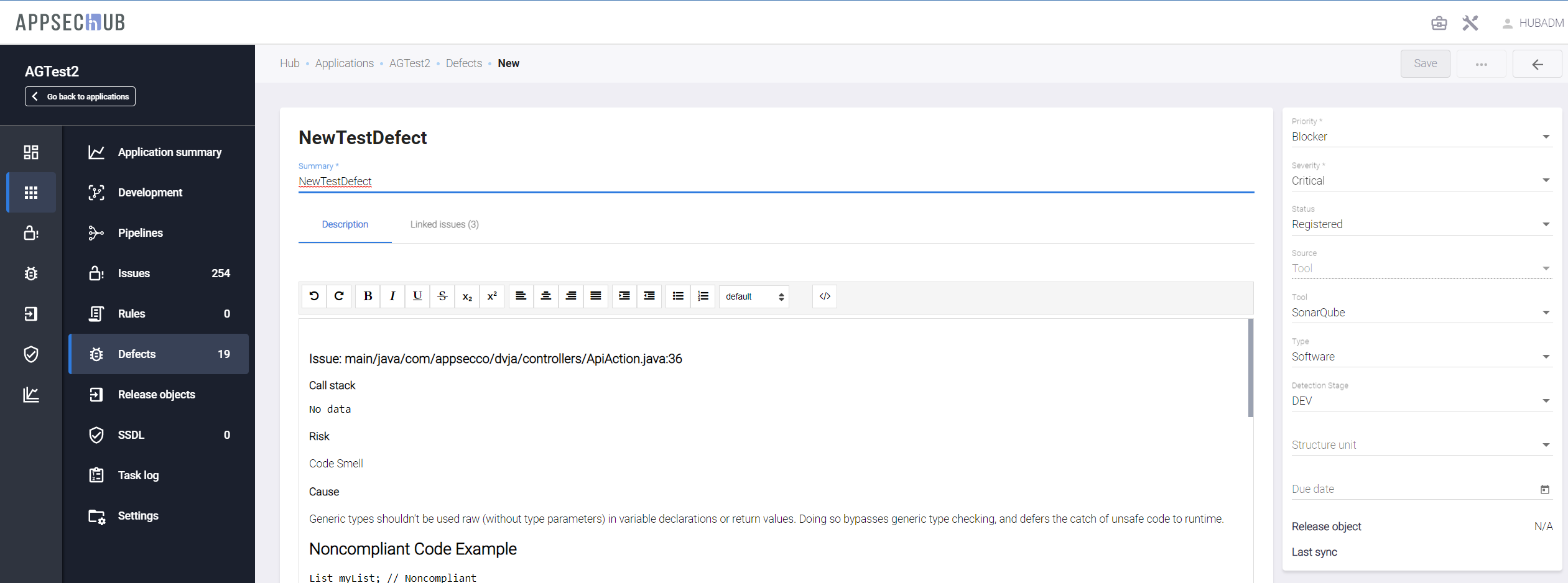 После выбора пункта Create defect на экране появится окно с информацией о создаваемом дефекте. Окно имеет две вкладки: Description и Linked issues. Вкладка Description содержит подробное описание дефекта безопасности, а вкладка Linked issues — перечень связанных с дефектом проблем безопасности с указанием их общего количества.