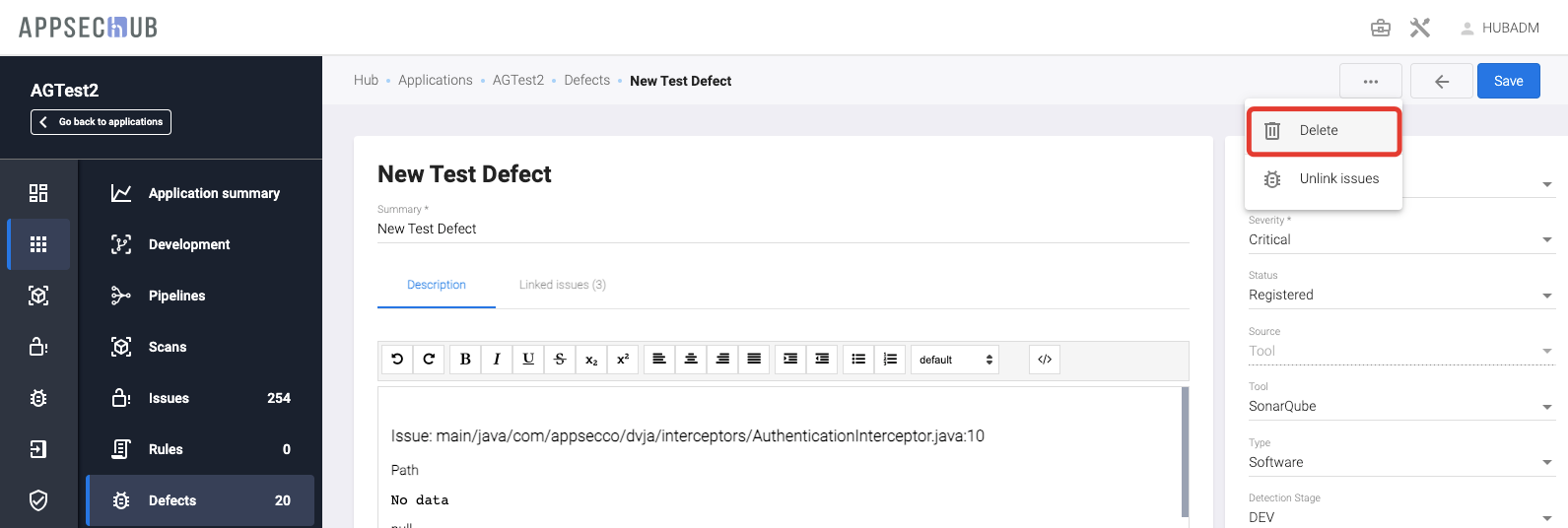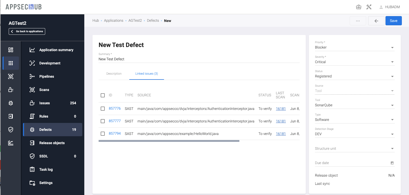 Предположим, что в AppSec.Hub был создан или обновлен один или несколько дефектов безопасности. Все вновь созданные или обновленные дефекты безопасности необходимо синхронизировать с проектной системой отслеживания дефектов (Jira или YouTrack).