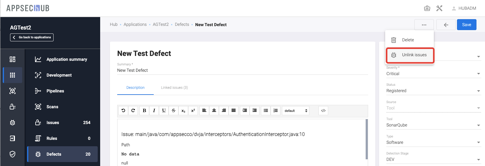 Также проблему безопасности можно открепить от дефекта на странице с детальной информацией о ней, нажав кнопку Actions и выбрав в раскрывающемся меню пункт Unlink from defect.