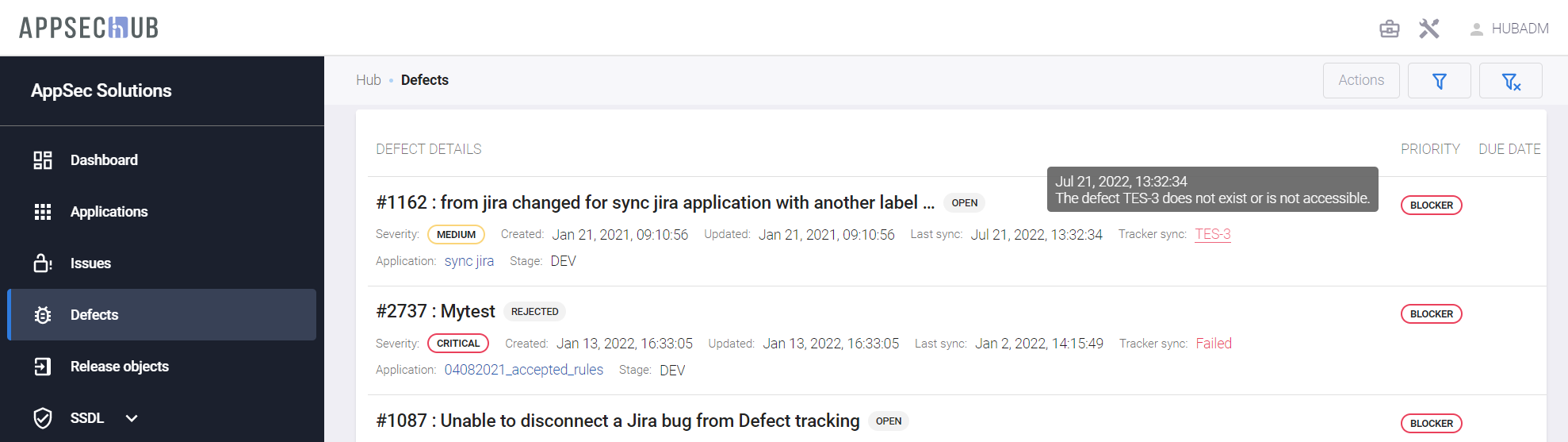 Дефекты безопасности были синхронизированы между AppSec.Hub и Jira. Обновленная информация о дефектах будет отображена на странице Defects.