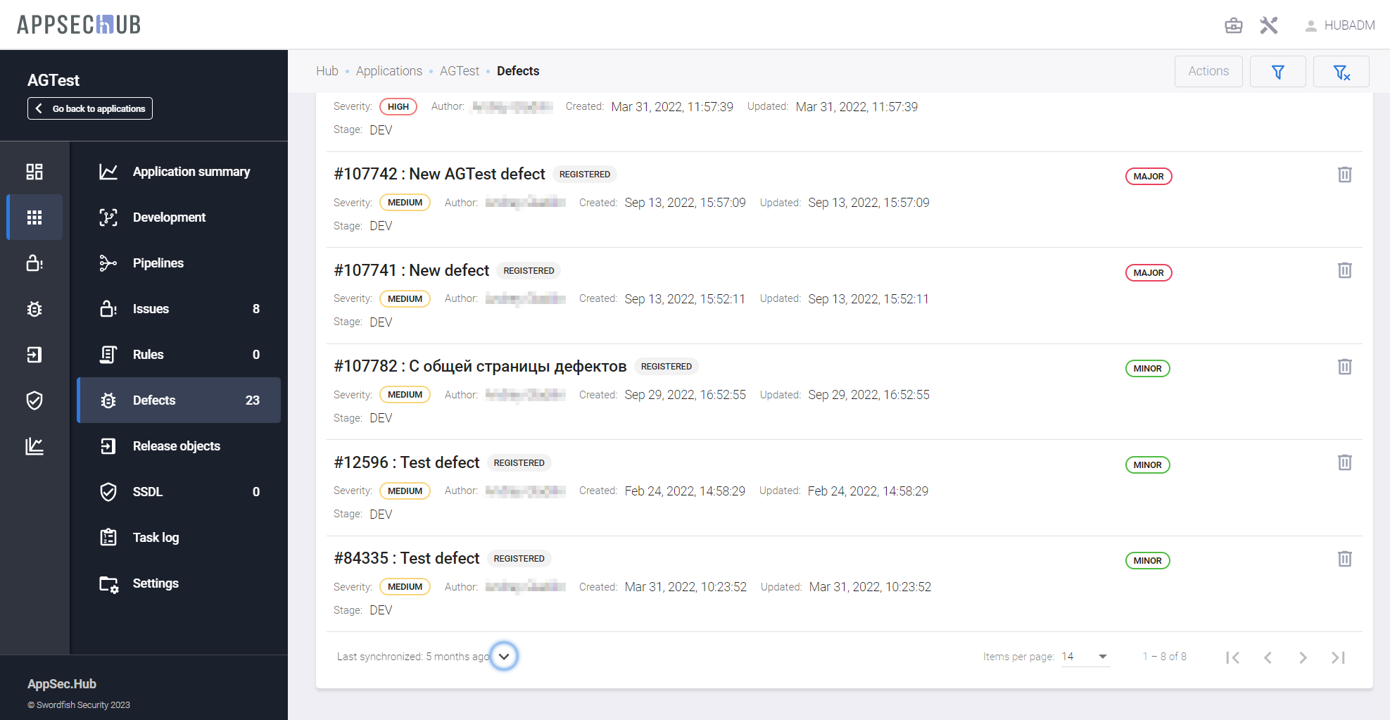 - Last sync — дата последней синхронизации дефекта с проектной системой отслеживания дефектов.