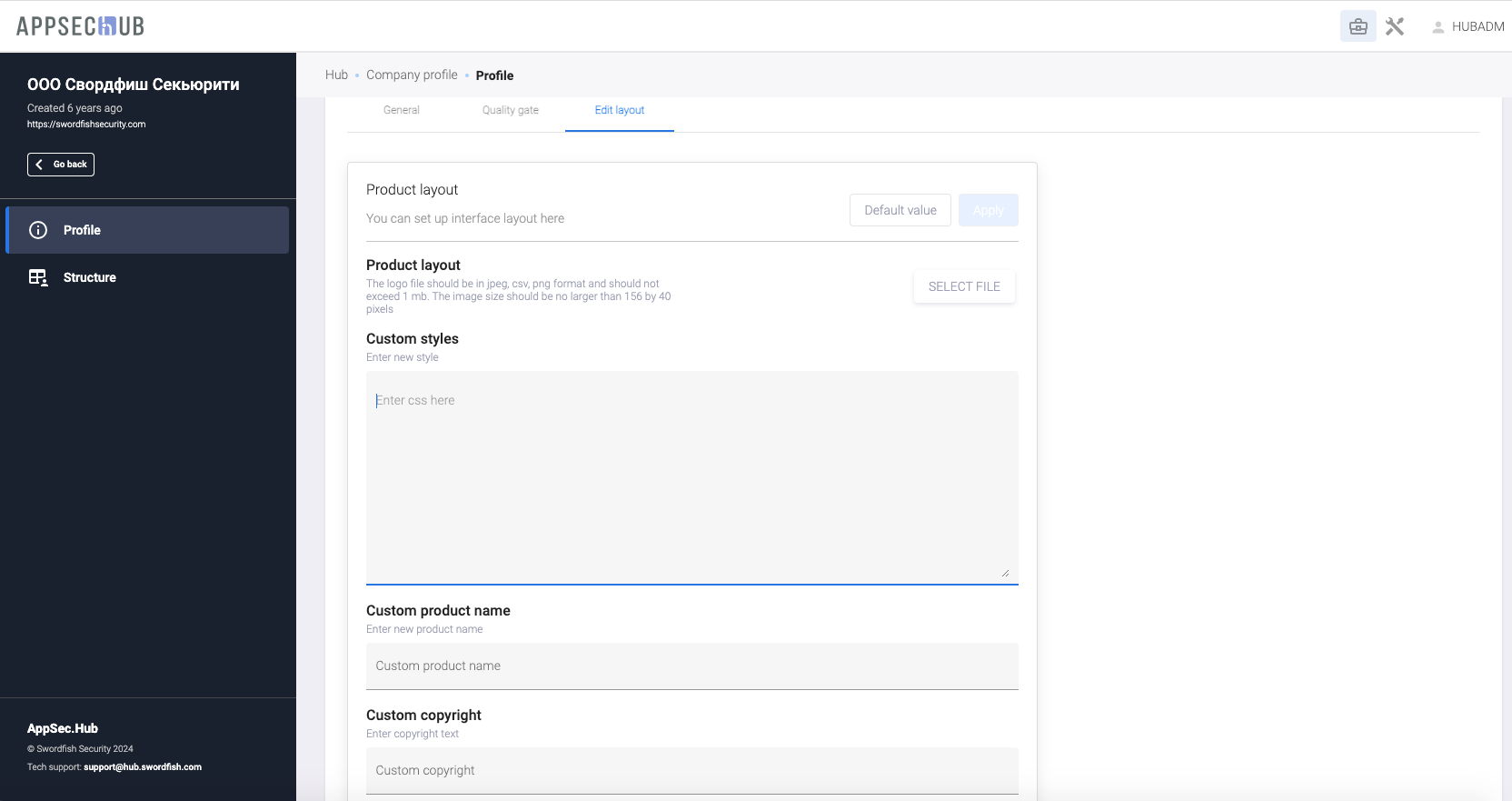 - Логотип компании, отображаемый в левом верхнем углу. Новый логотип можно выбрать в поле Product layout с помощью кнопки Select file. Чтобы вернуться к логотипу AppSec.Hub, нажмите кнопку Clear file.